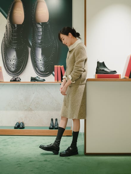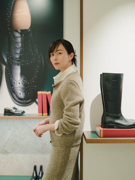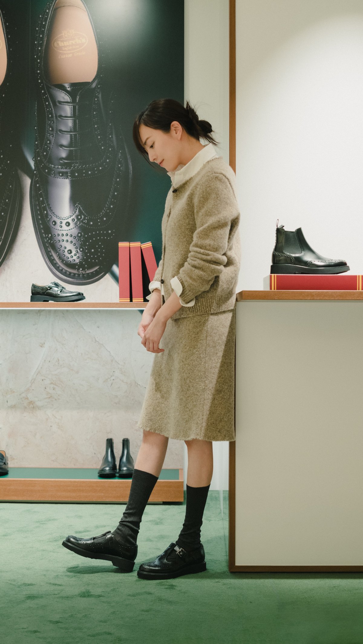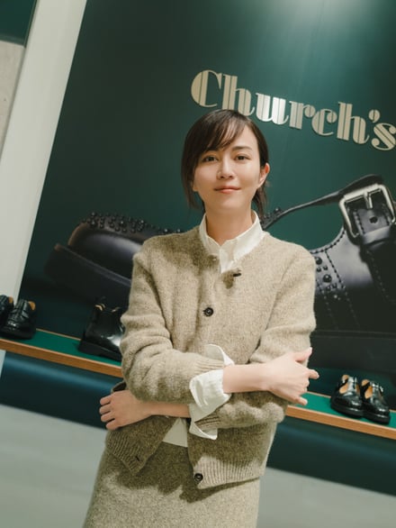 チャーチのシューズを10年以上愛用しているという比嘉は、「履きこむことで革が足に馴染んできて、“育てる”ような感覚があります。リペアを繰り返しながら、長く着用できるのも素晴らしいなと思います」と魅力を語った。新たに足を通したOdette Metについては、「トラディショナルでかっちりとしたデザインなので、トレンドに捉われず長く履けそうです。クラシカルなスタイルはもちろん、カジュアルな雰囲気のファッションにも似合いそうなので、いろんなスタイルが楽しめそうだなと思いました」とコメントした。