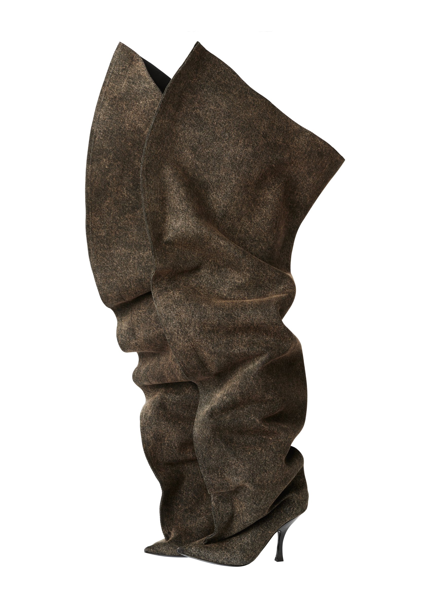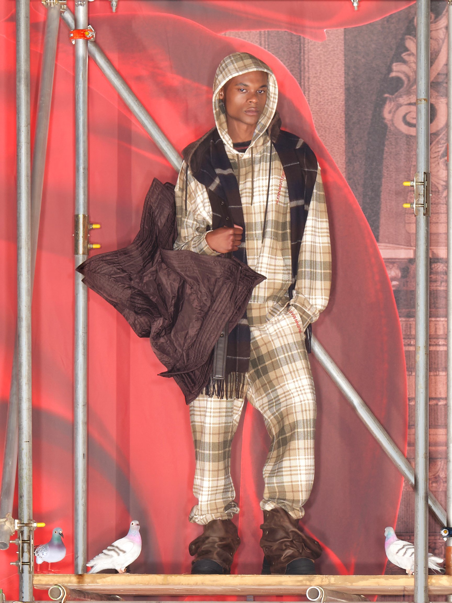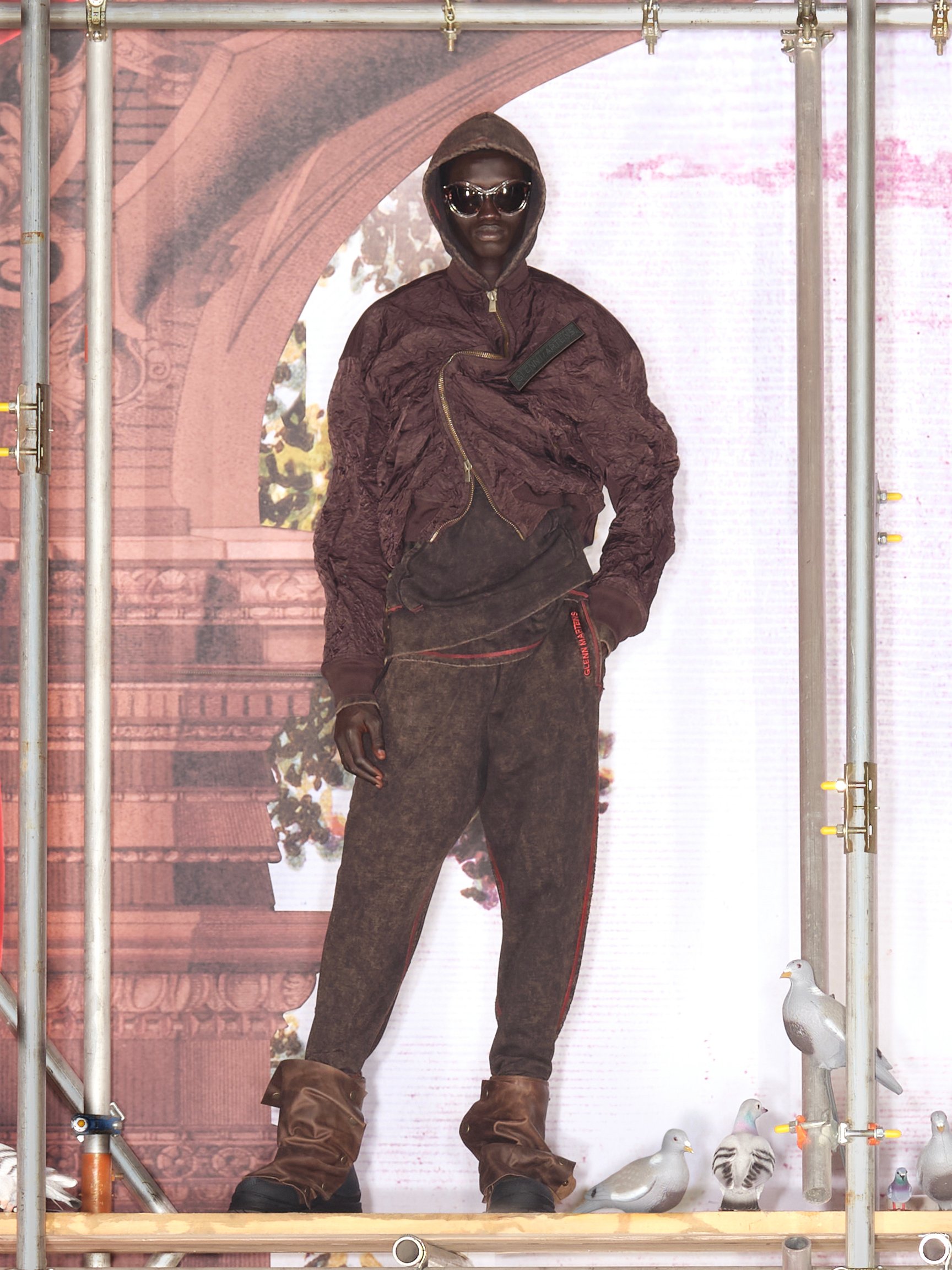 コラボプロジェクトはマーティンスが「メゾン・マルジェラ(Maison Margeila)」のクリエイティブディレクターに就任する前に遡り、約2年前に始動。コレクションは、当時グレンが在籍していた「ワイ・プロジェクト(Y/PROJECT)」 (今年1月にブランド終了)での代表作をオマージュしたフォイルやワイヤーを用いた立体的なシルエットにより着る人が自由に変形できるアイテムが多数。「ディーゼル(DIESEL)」のクリエイションでも見られる退廃的な加工が施されたアイテム、トロンプルイユ(だまし絵)などのプリントアイテムなど、マーティンスのこれまでの歩みを色濃く反映した全57型で構成された。
