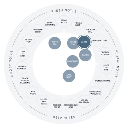 ホワイトは、真っ白な花束を両手いっぱいに抱えた幸福感をイメージした、ホワイトフローラルの香調。トップでは、みずみずしいアップルやベルガモット、ホワイトティーのさわやさが漂い、その後、ジャスミンやスズラン、ホワイトリリーが華やかに香る。最後は、ムスクやサンダルウッドのやさしく温かな余韻で締めくくる。