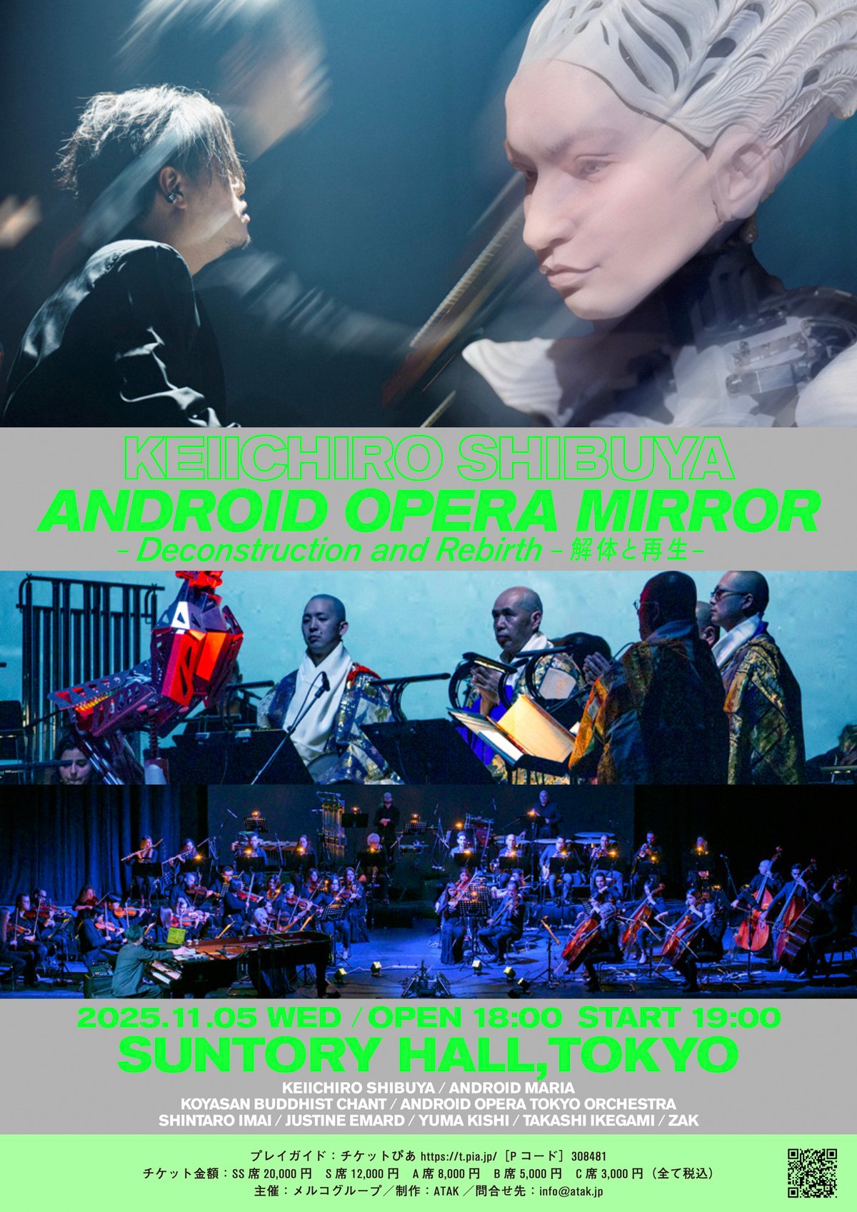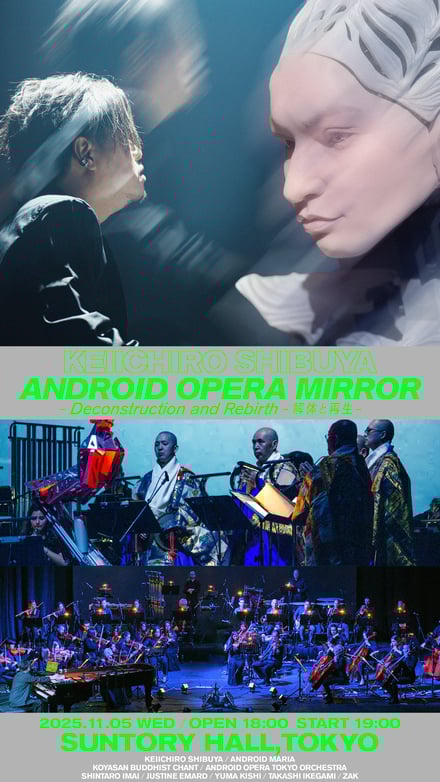 渋谷慶一郎が監修したアンドロイド・オペラ®の公演「MIRROR-Deconstruction and Rebirth-解体と再生-」がサントリーホールで開催される。上演日は11月5日。現在チケットをチケットぴあで販売中で、価格帯は3000〜2万円。