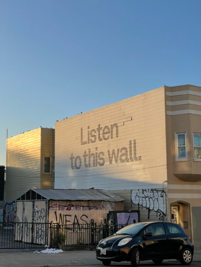 私の心に深く残った最初の作品のひとつが、ヘイト・アシュベリー地区にある「Listen to the Wall(壁の声を聞け)」と書かれたストリートアートである。派手さはないが、その言葉には足を止めさせる何かがある。