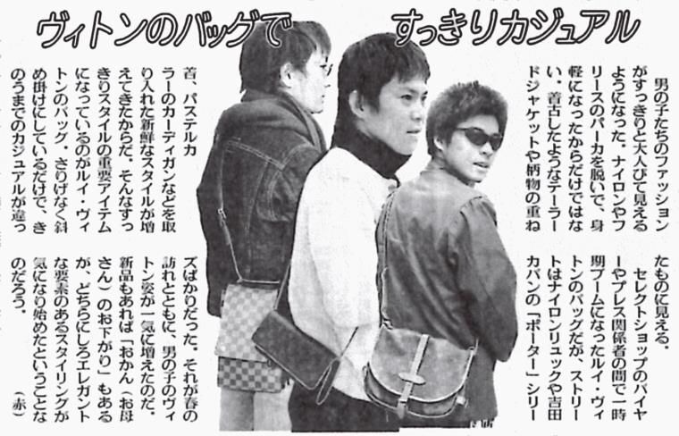 セレクトショップのバイヤーやプレス関係者の間で一時期ブームになったルイ・ヴィトンのバッグだが、ストリートはナイロンリュックや吉田カバンの「ポーター」シリーズばかりだった。それが春の訪れとともに、男の子のヴィトン姿が一気に増えたのだ。新品もあれば「おかん(お母さん)のお下がり」もあるが、どちらにしろエレガントな要素のあるスタイリングが気になり始めたということなのだろう。