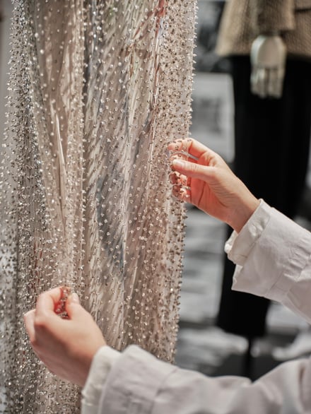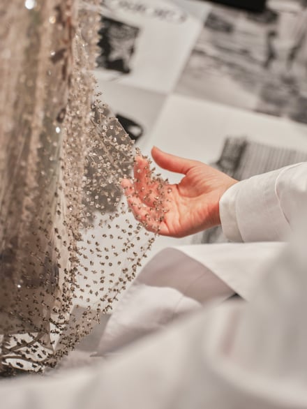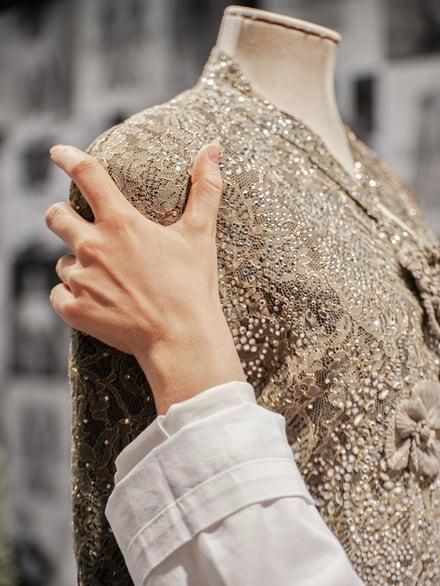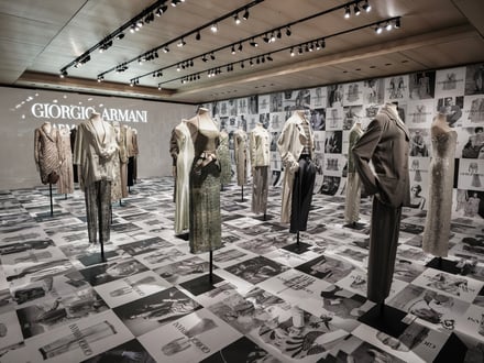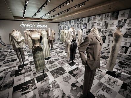 日本での展示は、現在ミラノのブレラ美術館で開催中の同名の展覧会に連動した企画で、イタリア以外では日本のみで開催。来日中の30体は、2000年にニューヨークのグッゲンハイム美術館で開催された回顧展に着想を得て、「色」「フォルム」「素材」で構成された。ブランドの象徴的なニュアンスカラーの中でも特にグレージュにフォーカスし、ビーズ刺繍やスパングルが施されたエレガントなドレス、代名詞でもあるメンズとウィメンズスーツなどが並ぶ。