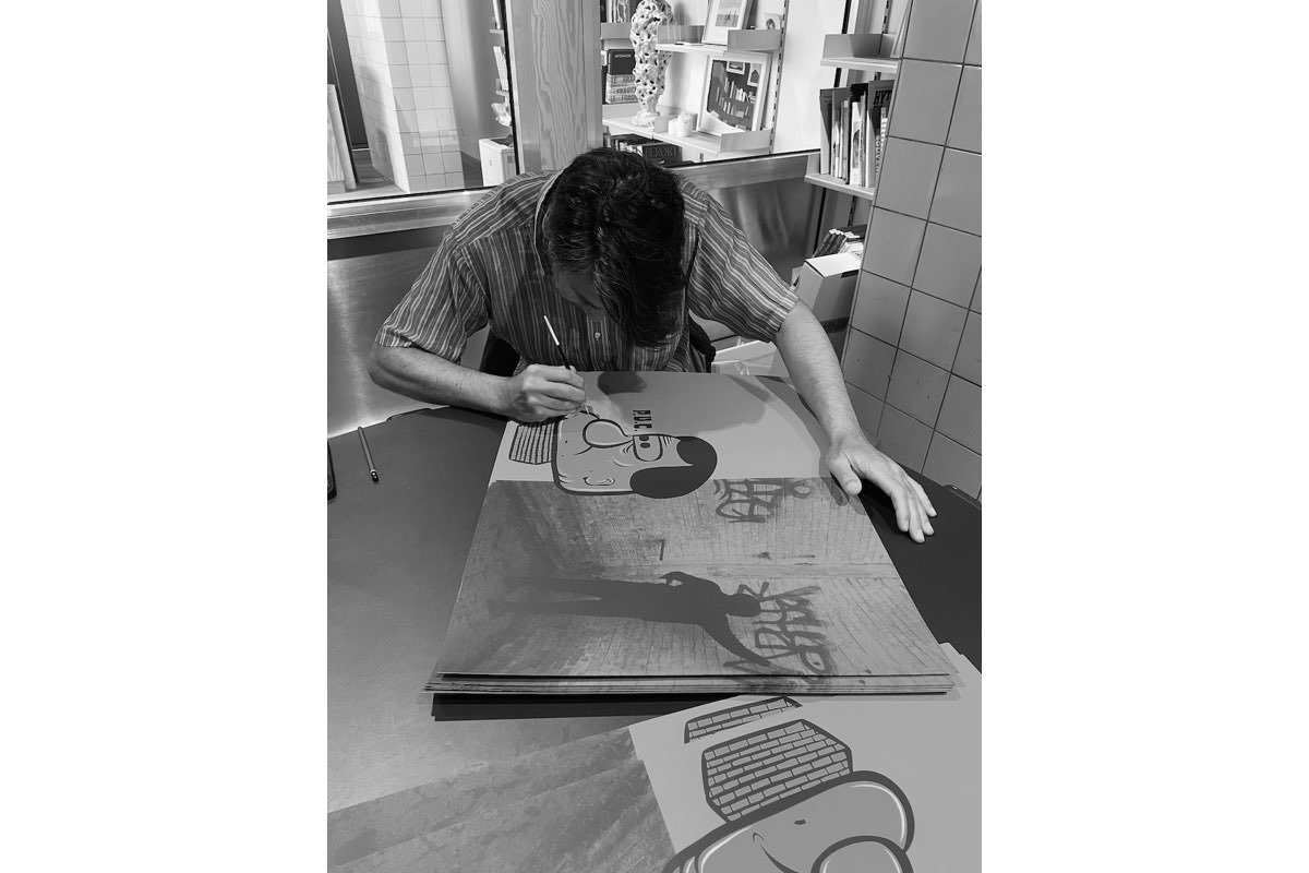 近年のマッギー作品では、人物や具象的な形はほとんど示されず、抽象的なパターンが前面に提示されてきた。今回のシルクスクリーンによる限定版プリントでは、アーティストが自身の原点に立ち帰りながらも、新たなキャラクターや人物像をオーバーレイで配置し、「版画」というメディアを用いた新たな展開を見せる。バリー・マッギーは10月初頭に来日。オスジェメオスとともにワタリウム美術館にて共同制作し、ディナーをとり、話し合い、時にふざけ合いながら多くの時間を信じ難いほどの集中と没頭の中で過ごしている。その熱量が漂う地下空間に足を運び、彼の表現の現在を見つめてみてほしい。