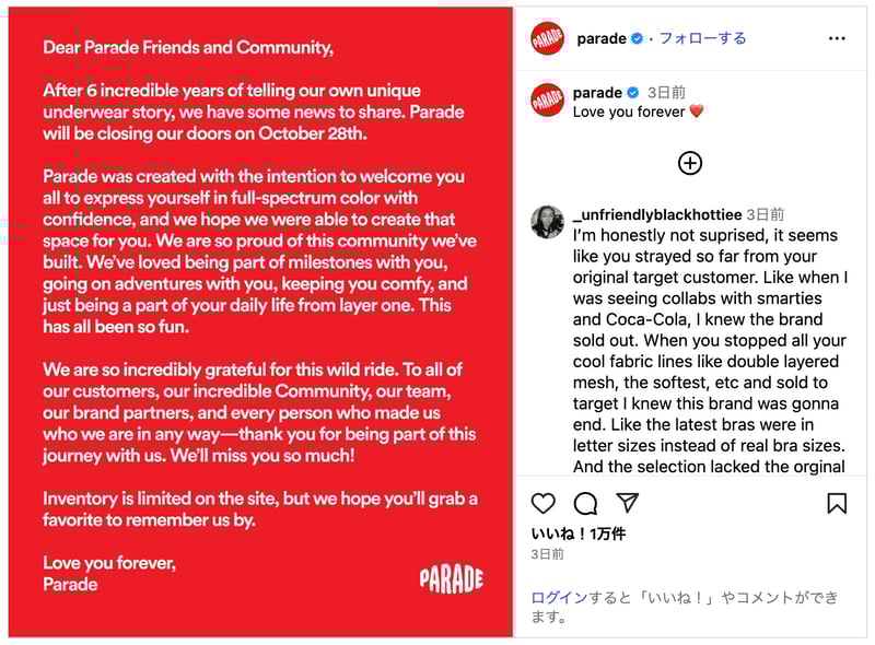 アメリカ・ニューヨーク発の下着ブランド「パレード(Parade)」が現地時間10月28日をもってサイトを閉鎖すると発表した。立ち上げから6年でブランドの活動に終止符を打つ。