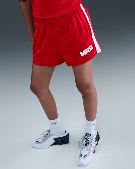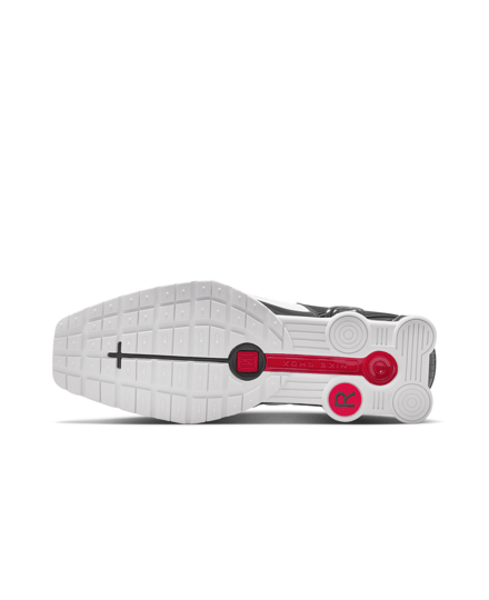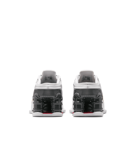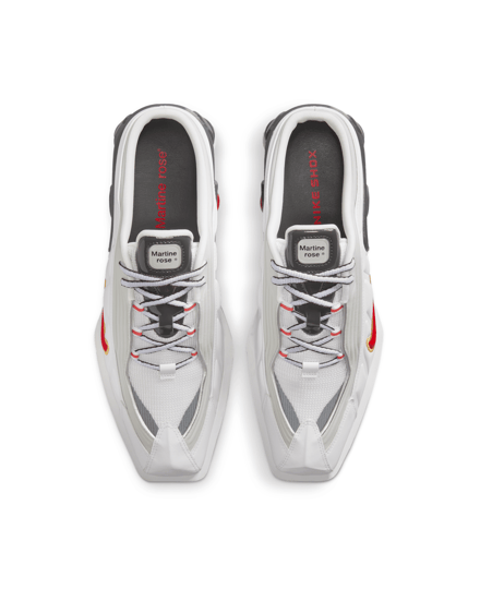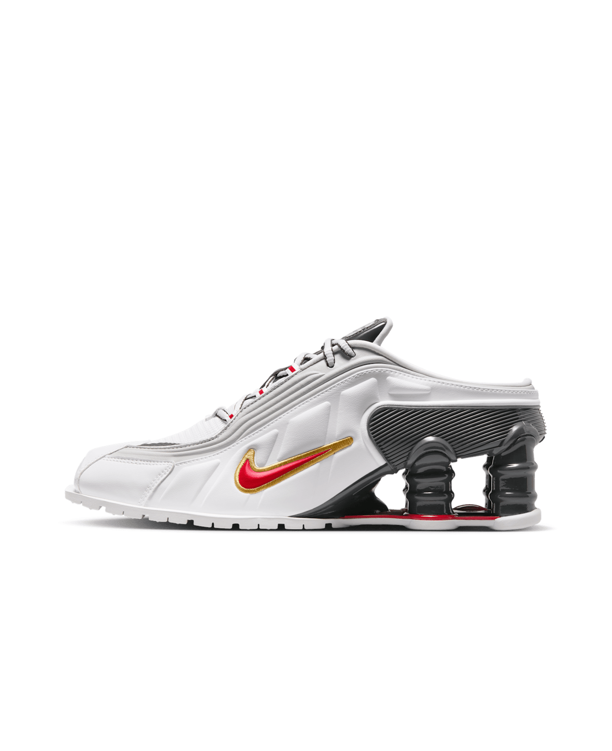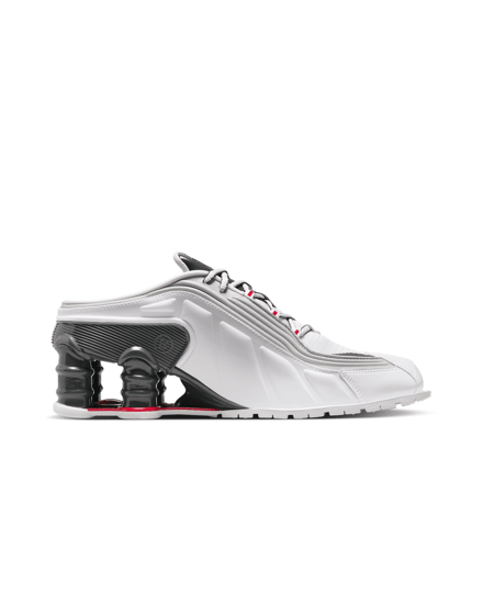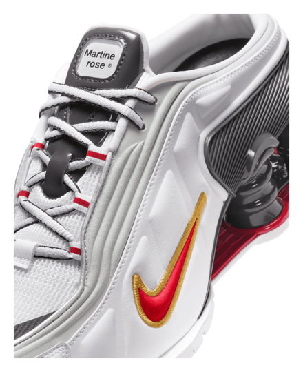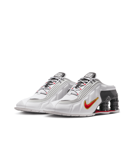 コラボシューズは引き続き「ショックス MR4(SHOX MR4)」をベースに採用。サッカーギアを着想源に、ドレスシューズの要素とスポーティーな感覚を組み合わせ、ミュールのシルエットとヒールを支える柱状のデザインを採用しスクエアトゥ型に仕上げた。アッパーは光沢のあるホワイトカラーが特徴で、バーシティレッドとゴールドのスウォッシュが配されている。