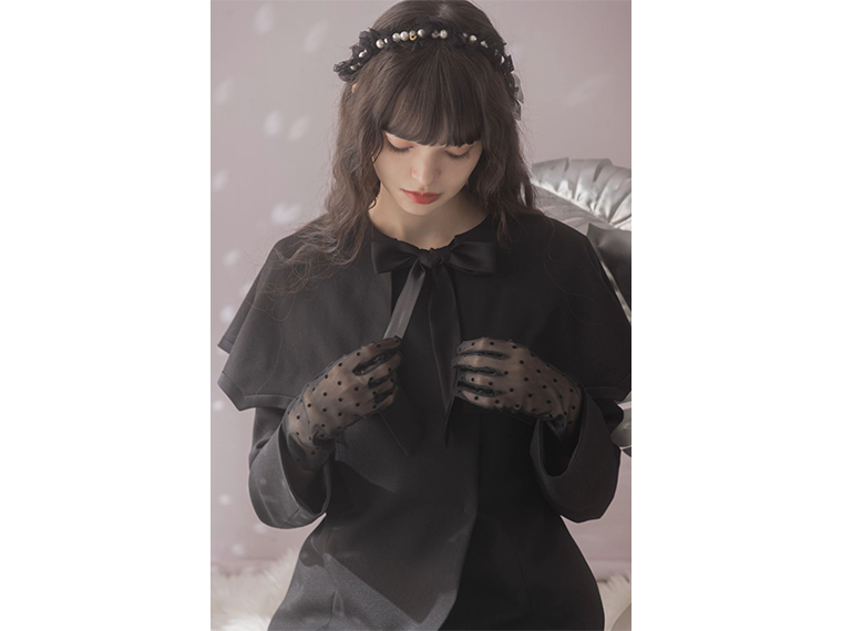 クロミの「黒頭巾」をイメージしたケープとジャケット、ワンピースのセット(税込み4万2900円)と、大きな襟と袖口レースのジャケットとワンピース、クロミとお揃いの付け襟がセットのブラックコート(3万1900円)を企画した。ケープと袖口レースは取り外し可能で、シンプルなフォーマルスタイルにもなり、ケープと付け襟は普段のコーディネートにも着回しできる。「葬儀にも安心して参列でき、急な冠婚葬祭にも備えられる一着」という。