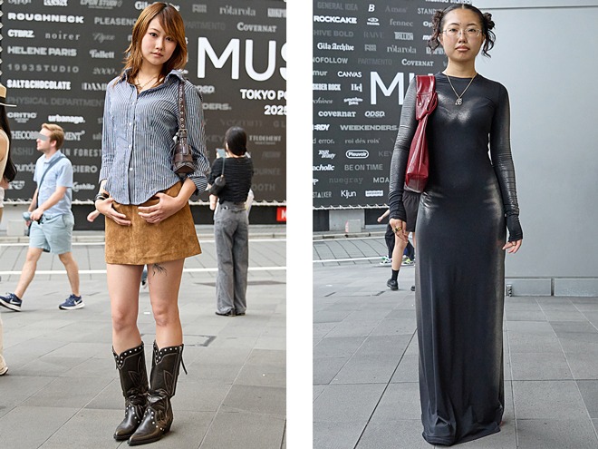 (左)「ブーツとバッグはザラのもの。同じ色合いで揃えました」と話す女性(https://www.web-across.com/observe/ppce54000005maol.html)。スカートも茶系のスウェードで統一した着こなしがおしゃれ。(右)「ずっと好き」だというディーゼルのドレスを纏った女性(https://www.web-across.com/observe/ppce54000005matd.html)。パルコにはkemio展を見に来たそう。