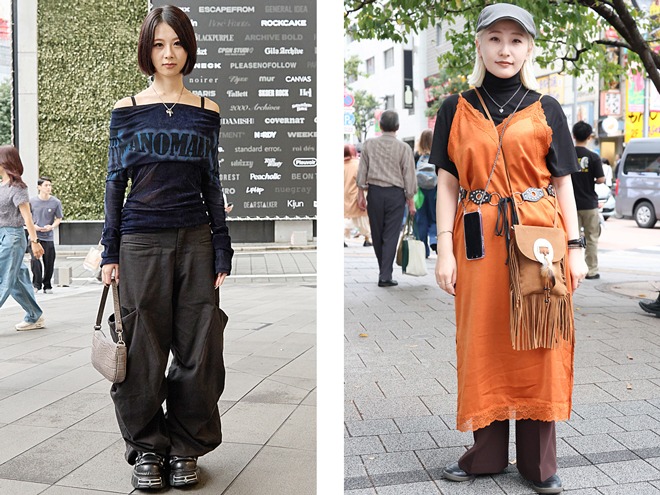 (左)ベロアのトップスはアノマリーズディパートメントのもの。「K-POPアイドルの着用ブランドで、実物をみたら好きになりました」とい話す女性(https://www.web-across.com/observe/ppce54000005mba3.html)。(右)鮮やかなオレンジが目を引くサテンのワンピースを着用した女性にインタビュー。フリンジやコンチョなど、00sにブレイクしたボヘミアンなテイストも再浮上している(https://www.web-across.com/observe/ppce54000005mcox.html)。