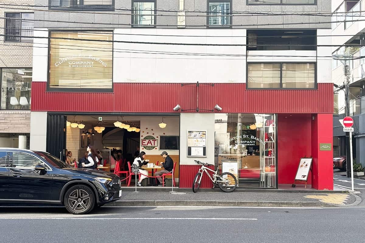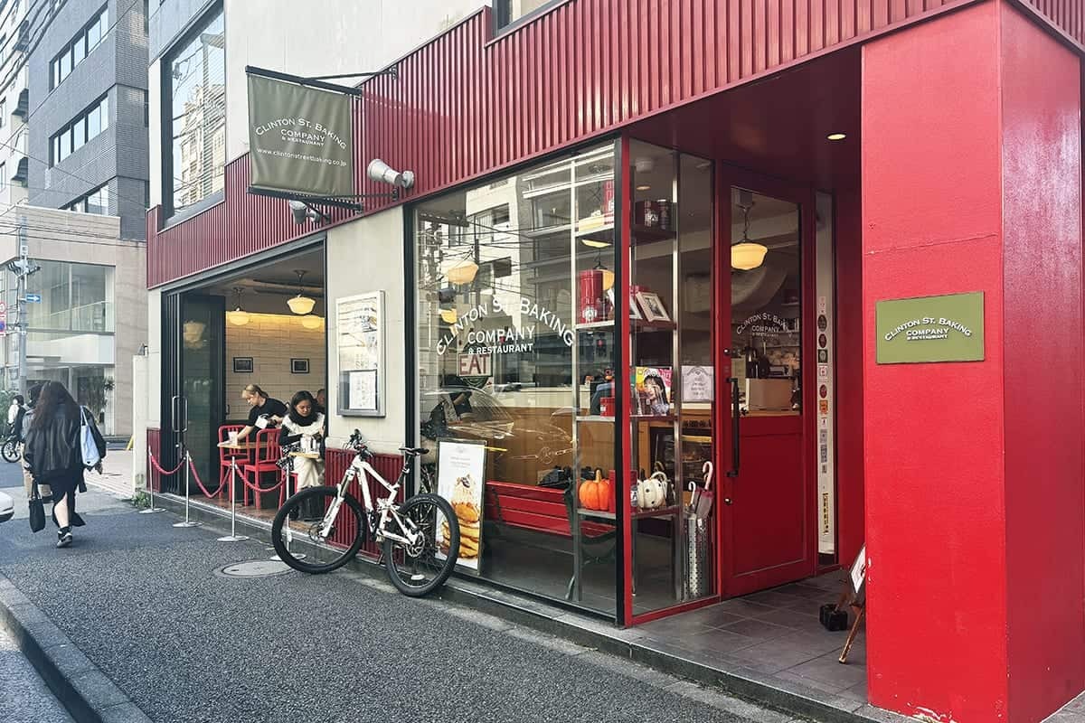 骨董通り沿い、スターバックス コーヒーの入っているビルの斜め向かいに「Clinton Street Baking Company Tokyo」はある。真っ赤な塗装の外壁と、前面ガラス窓の雰囲気のいいおしゃれな外観。骨董通りにありながら、確かにニューヨークの街の一角を彷彿とさせる趣だ。
