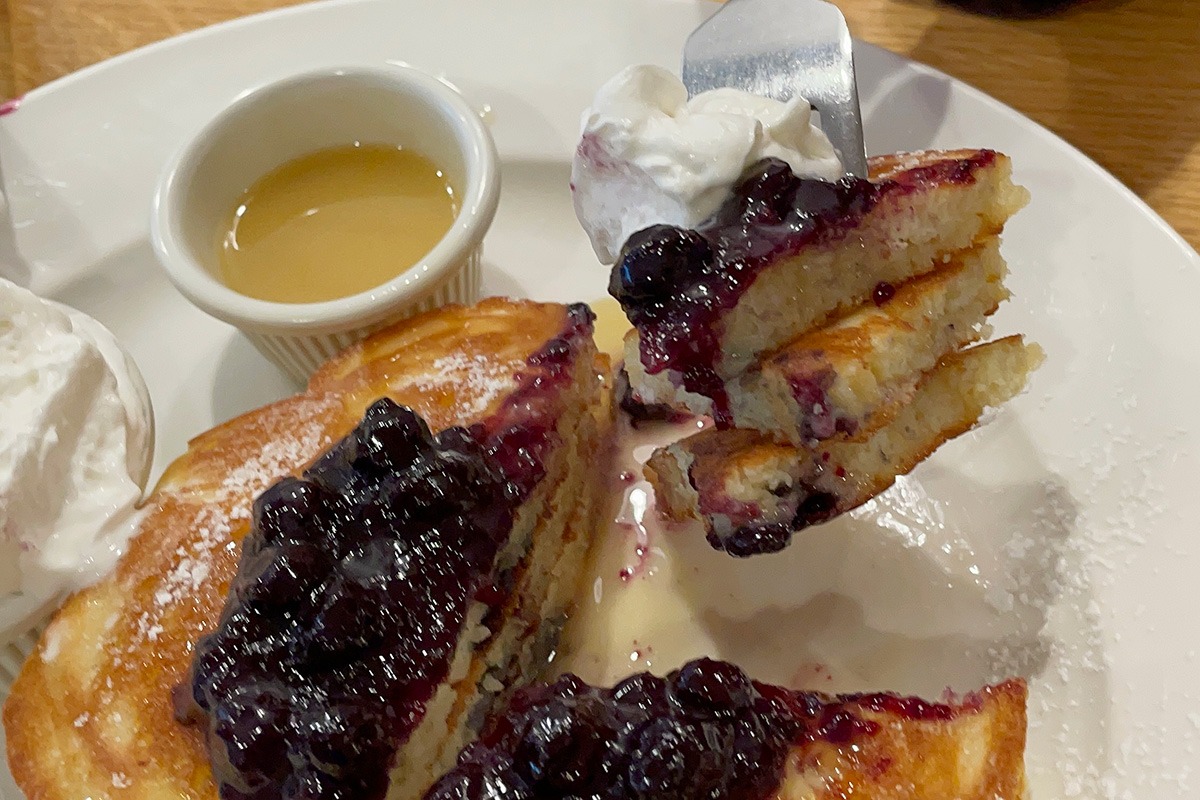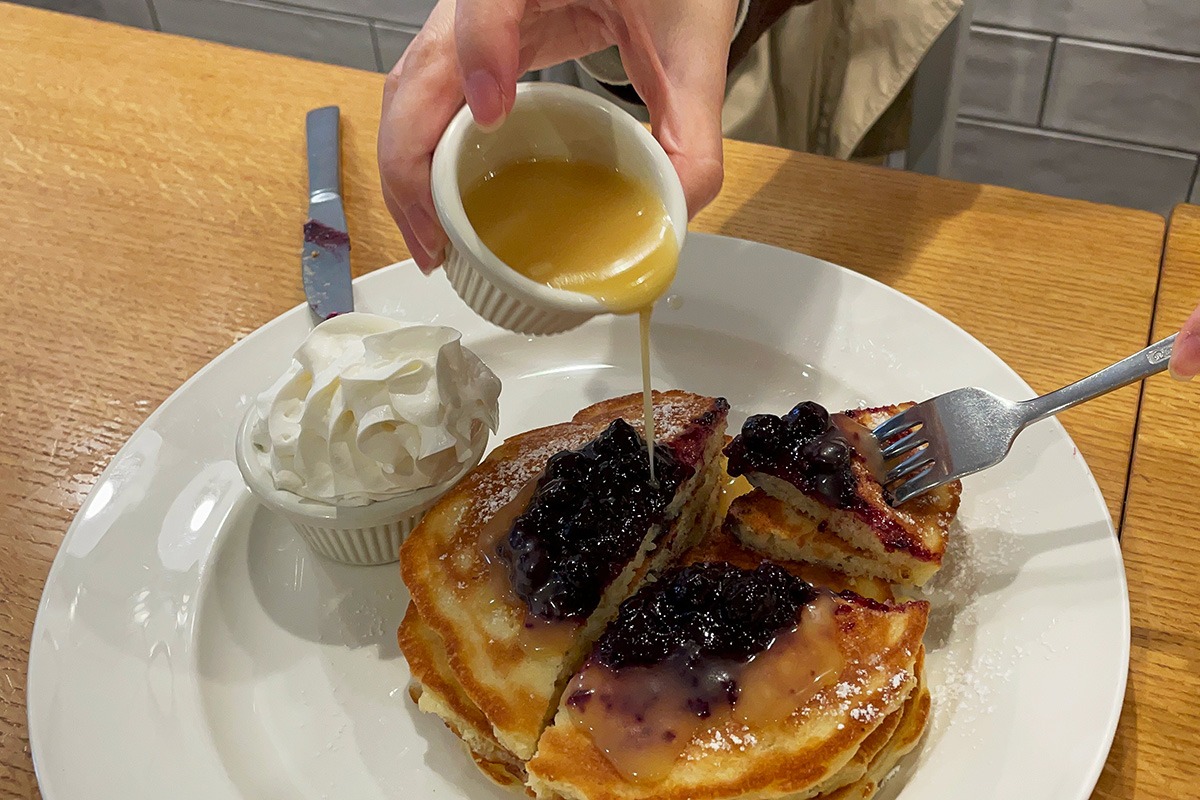 カットしたパンケーキ全体ににメープルシロップを豪快にかけて、いただきます。大粒でジューシーなブルーベリーの程よい酸味とふわふわパンケーキに、甘塩っぱいメープルシロップのパンチが合わさってやみつきになるおいしさ!