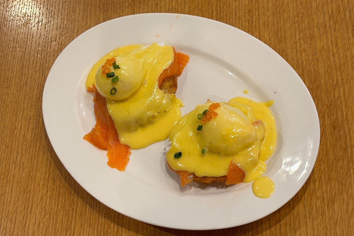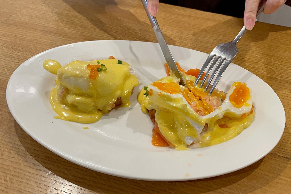甘いものと塩っぱいものを交互に食べれるのがシェアランチの醍醐味!ということでパンケーキと一緒に頼んだのは、ノルディックベネディクト。オランデーズソースに、スモークサーモン、イクラ、ネギが乗った10月限定のお月見エッグベネディクトスペシャル。鮮やかでおしゃれな見た目に気分が高まる。