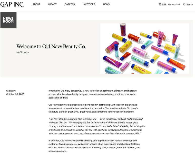 ギャップのデブ・レッドモンド(Deb Redmond)ヘッド・オブ・ビューティは、「Old Navy Beauty Co.は単なる商品ラインではなく“体験”だ。ブランドらしい包摂的で楽しいスピリットをビューティ領域にも広げ、オールドネイビーで“ビューティを買う楽しさ”を新たに提供する」とコメント。2025年秋のローンチ後はテスト&ラーニング期間を設け、顧客のニーズを分析しながら、2026年夏に全米での展開を予定しているという。