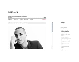オリヴィエ・ルスタンはフランス・ボルドー出身。「ロベルト カヴァリ(Roberto Cavalli)」のインターンとして18歳でキャリアをスタートし、5年間働いた経歴を持つ。2009年にバルマンに加入。ウィメンズのプレタポルテラインを手掛けた。2011年4月、前任のデザイナーでバルマンを再起させたクリストフ・ドゥカルナン(Christophe Decarnin)の後任として、クリエイティブディレクターに昇格。当時25歳だったが、オリヴィエによる新生バルマンは評価が高く、14年にわたり同ブランドのクリエイションを牽引した。2025年秋冬シーズンは“新生バルマンの幕開けを告げる一章”と位置付けたコレクションを披露していた。なお、在任中の2016年にバルマンはカタールの投資企業 メイフーラ(Mayhoola)に買収されている。