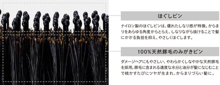 リファハートベルベットは、本体にベルベット素材とメタリックな立体ロゴを使用することで高級感を演出。また、やわらかかつしなやかで、ダメージヘアにもやさしい天然豚毛を採用した。同アイテムは、優れたしなり感のあるナイロン製ほぐしピンが髪のからまりをほぐしたあと、豚毛に含まれる適度な水分と油分が髪になじむことでツヤをもたらし、からまりづらい髪に導く。