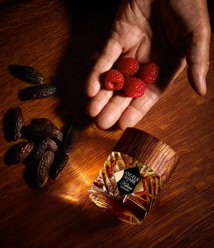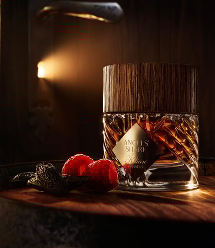 香りは、エンジェルズ シェアのシグネチャーアコードに、ラズベリーリキュールをブレンド。ブルガリアンローズオイルとシナモンバークオイルの豊かな香りが広がった後、サンダルウッドアルバムオイルやトンカビーンアブソリュートのウッディでグルマンな香りへと移り変わる。新鮮で自然なラズベリーの瑞々しさを再現する技術によって、グリーンとフローラルが混ざり合う恍惚の味わいを叶え、さらにブルガリア産ローズオイルの芳醇な香りを組み合わせた。