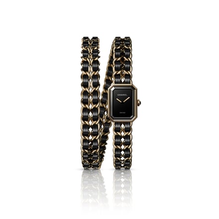プルミエールは、フレグランス「シャネル N°5」のボトルストッパーを想起させる八角形のケースと、ブラックラッカー仕上げのダイヤル、アイコニックなハンドバッグを象徴するブラックレザーを編み込んだチェーンブレスレットなどを特徴とするウォッチコレクション。