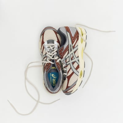 コラボシューズのベースには、アシックスの「GEL-NIMBUS 10.1」を採用。同シューズは2008年に登場した「GEL-NIMBUS 10」のアッパーと「GEL-KAYANO 14」のソールを組み合わせたハイブリッドモデルで、足元の骨格に対応したアシンメトリーのアッパーデザインや特徴的なオープンメッシュを使用し、ミッドソールに二重構造のEVAフォームや、「GEL」テクノロジー、「TRUSSTIC」システムを搭載している。