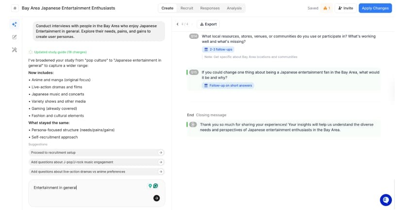 まず、「ベイエリアで日本のポップカルチャーを楽しむ人のペルソナ作成をするために、ニーズ、ペイン、ゲインを探索するインタビューを行いたい」というリサーチテーマをチャット画面に入力すると、自動でスクリーナーサーベイ(参加者を募集・絞り込みするためのアンケート)とインタビューの質問が生成される。