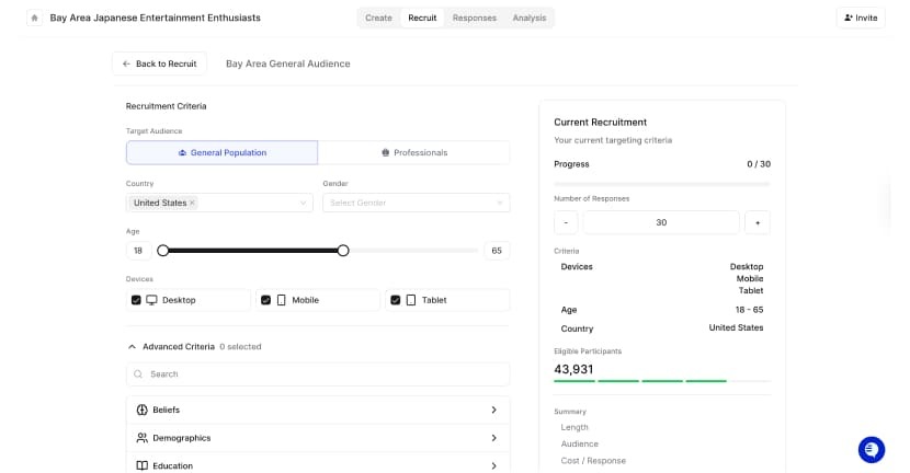 一方、私がListen Labsで募集した際には条件とぴったり合った相手は選定できなかったため、ピンポイントのユーザーには巡り合いづらそうだと感じた。