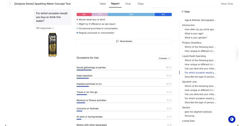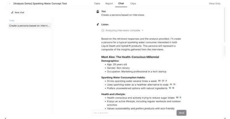 プロジェクト内容に関わるため実際のデータそのものを公開することはできないが、このテーマでのListen Labs使用事例を再現して、一部お見せしよう。