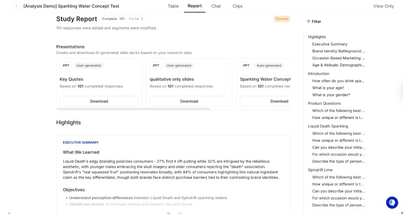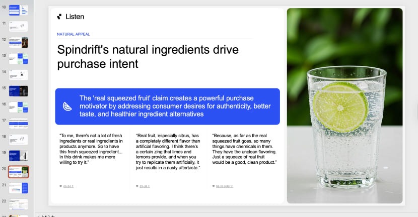 リサーチを行っていると、こうしたインタビュー結果のレポートスライドの作成に苦労するところだが、なんとListen Labsではスライド形式でのレポート作成もAIが行ってくれる。
