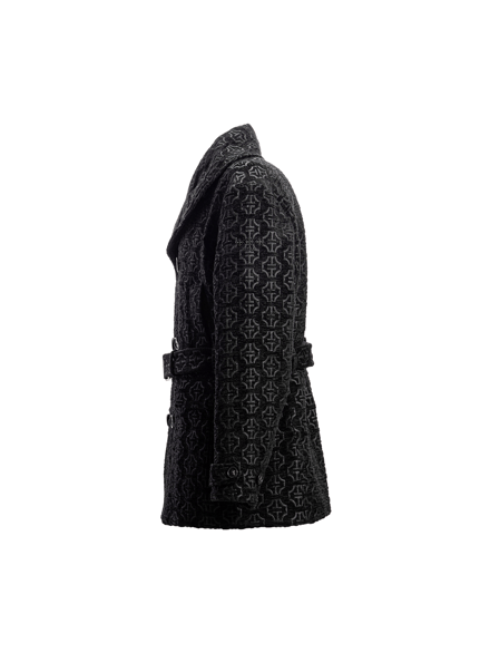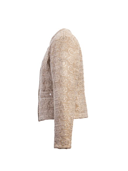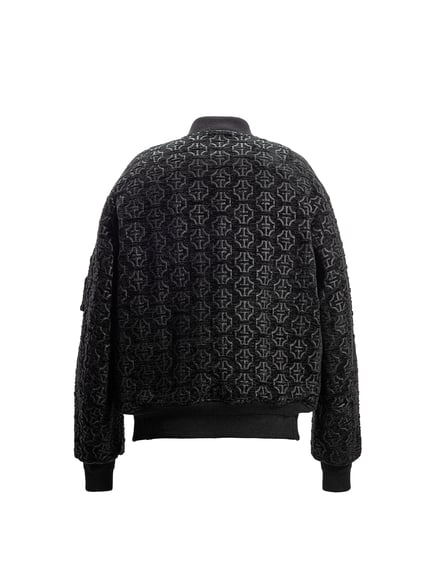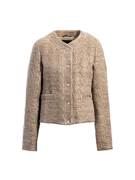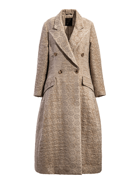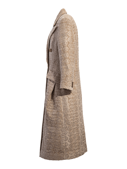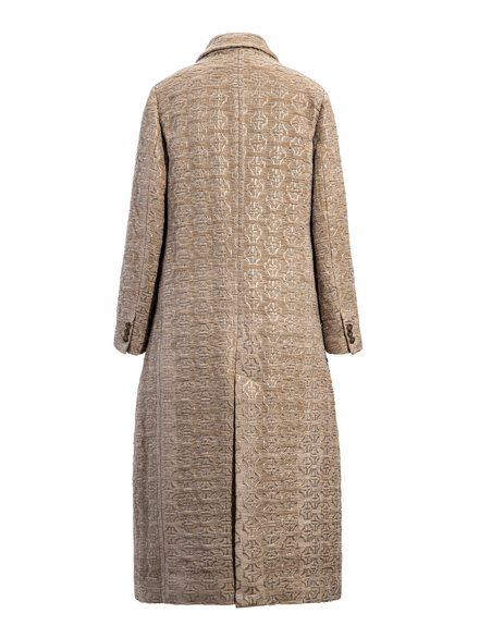 デザインは、ブランド名の由来である「山脈」と、日本の文化を象徴する「家紋」をモチーフにしたモノグラムをイメージ。HOSOOの職人の手で織り上げられた生地は、太めのモール糸と箔のレイヤーを重ね織りすることで、西陣織特有の複雑で立体的な構造を表現している。