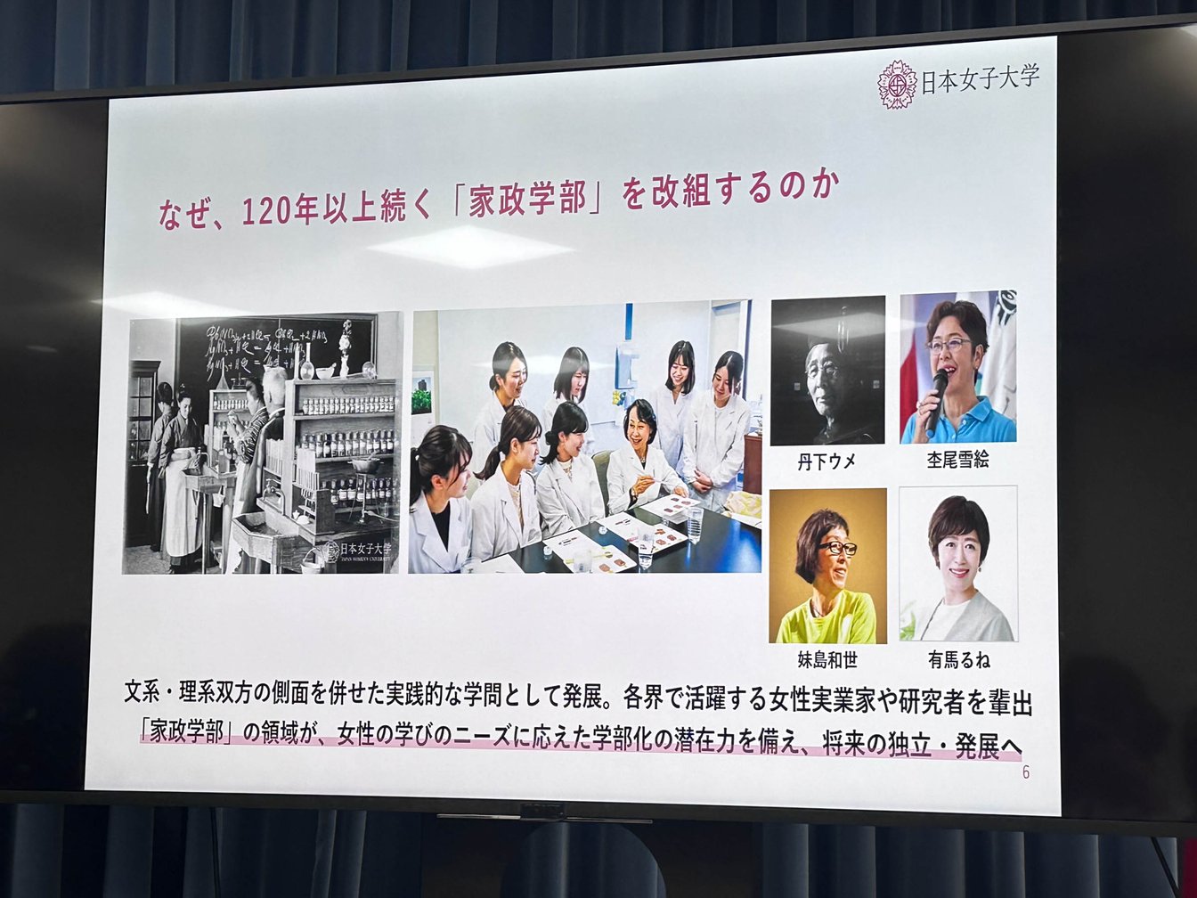 家政学部の再編は、各領域が時代のニーズに応じて専門性を高めてきた一方で、従来の家政学という枠組みではその学びを十分に包摂できなくなってきたこと、さらに同校の家政学部が化学・生物・物理・数学・情報・工学など多様な理系分野を内包していることから、それぞれが独立した学問領域として更なる発展が期待できることに基づくものだという。これまでは家政学部に含まれていることで各学科の専門性が外部から見えにくいといった課題があったが、各学科を学部として“株分け”することで、より各学部の専門性を強めたカリキュラムを提供していく。永田副学長は改組の背景を「創業当時から理系的な自然科学の要素を女子教育に採用していた姿勢は非常に先駆的であり、同校の看板でありました。だからこそ、今の時代に合わせた発展が必要だと考えました」とコメント。篠原学長は、「18歳人口が減少する一方で、女性の大学進学率は5割を超え、多様な生き方が広がっています。しかし、日本のジェンダーギャップ指数は2025年時点でも118位と非常に低く、女性が主体的にキャリアを築ける環境はいまだに十分とは言えません」とし、「キャリア形成に直結する実学や理系分野を含む多様で専門性の高い学びを求める受験層が増加しています。こうした女子学生のニーズの多様化に対応するため、本学は時代の要請に応えられる女子総合大学としてあり続けるため学部再編を進めています」と説明した。