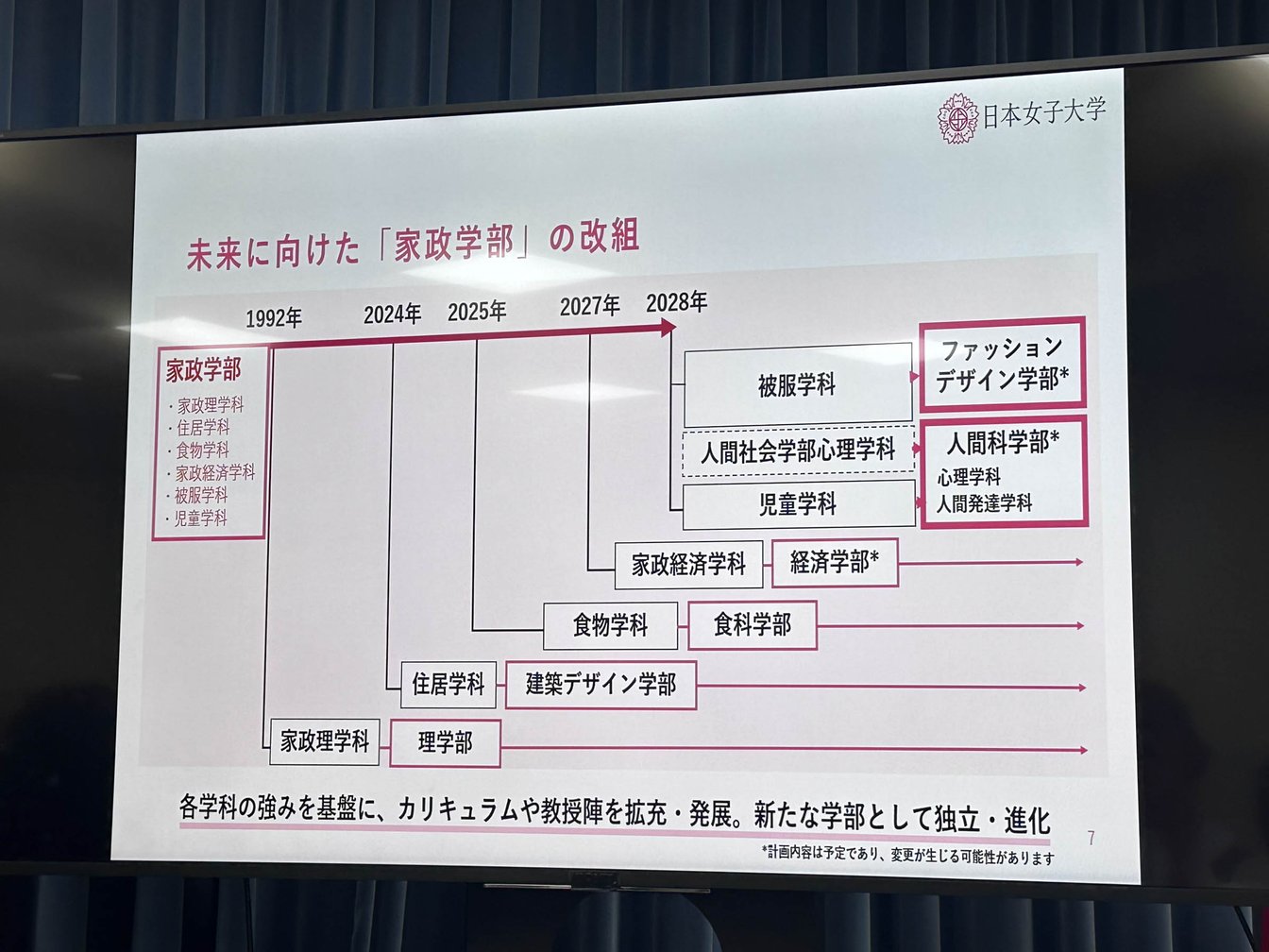 家政学部の再編は1992年に家政理学科を私立女子大として唯一となる理学部へと学部化したことに始まり、近年では2024年に住居学科を建築デザイン学部に、2025年に食物学科を食科学部に変更。2027年には女子大学として初の経済学部(旧 家政経済学科)の開設を予定している。