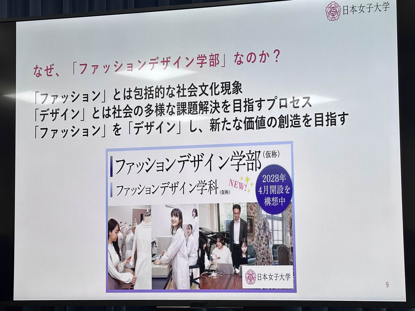 2028年4月に開講を予定しているファッションデザイン学部は「ファッション」を社会文化的な現象として捉え、「デザイン」を社会課題を解決する活動・プロセスとして定義。「デザイン」「テキスタイル」「アート」「ビジネス」の文理融合4分野から多角的にアプローチし、「着る」「身に着ける」「装う」といった行為を切り口に人間の生活、社会システムやデザインを人文社会科学および自然科学の視点から学際的に学ぶことができるカリキュラムを用意するという。ファッション学科のみの1学部1学科制で、定員は85名。教授陣は一部入れ替えを行い、特にビジネスとデザインの部門の教員を強化していく。デザイナーなどを招へいした特別講義など、学生から注目を集めそうなコンテンツも検討しているという。