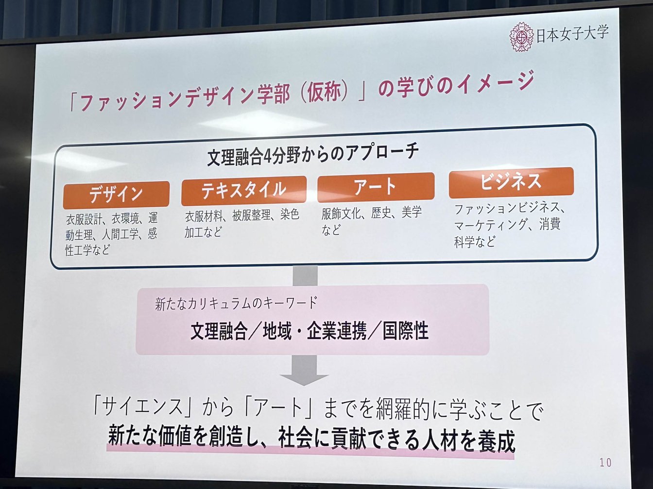 同校の家政学部被服学科は、これまで大学の被服分野で全国トップのポジションを確立してきた。一方で、人文学的な視点からファッションを学びたいという潜在的なニーズを持つ学生はこれまで家政学部ではなく、経済学部や繊維学部を選択してきた例も多かったのではないかという考えのもと、今後はそうした学生たちの受け皿になれる環境を提供することを目指す。