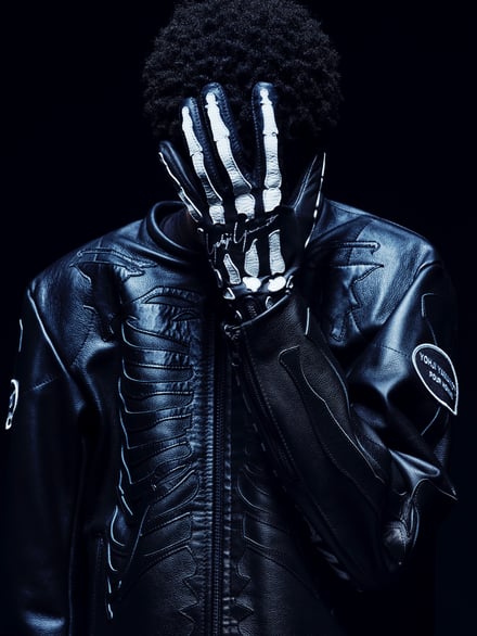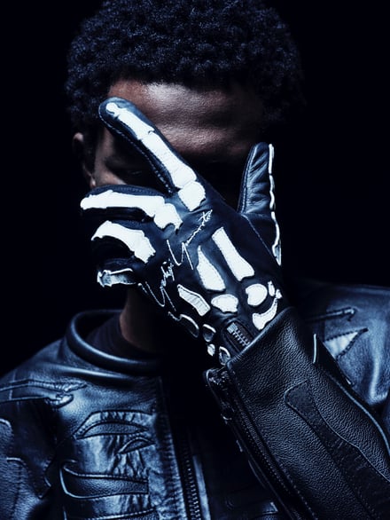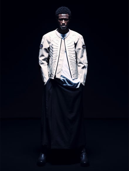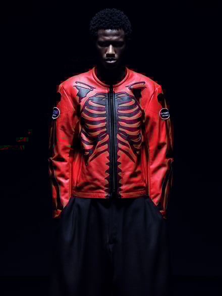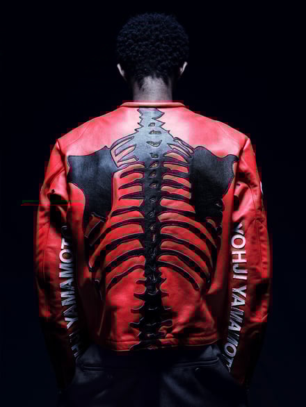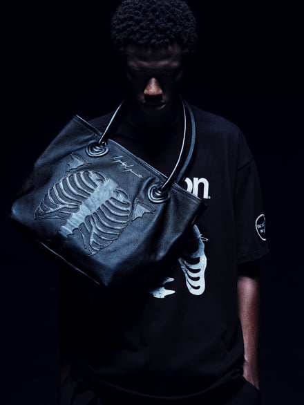 バンソン レザーズとのコラボでは、同ブランドのシグネチャーである「BONEデザイン」をヨウジヤマモト プールオムの視点から再解釈したジャケット(96万8000円)やバッグ(24万2000円)、グローブ(19万8000円)など5型をラインナップ。ジャケットはシングルライダースに立体的な骨モチーフのダブルレザーパネルを配置した伝統的なデザインが施されており、BONE柄のトートバッグでは、フロントやバックパネルやレザーパッチの配置を変更した特別仕様となっている。
