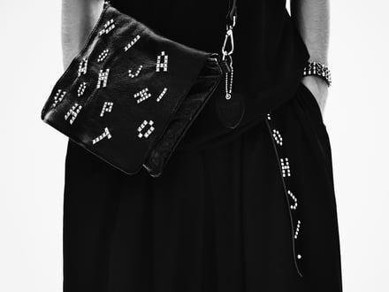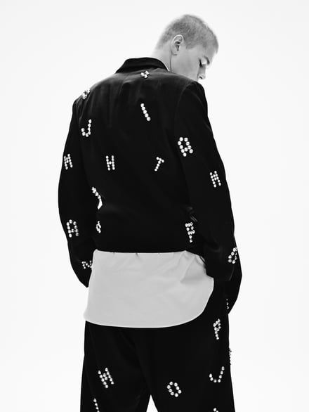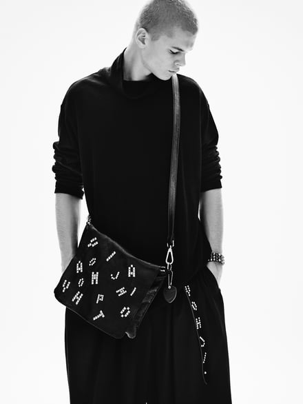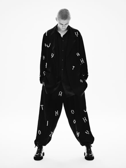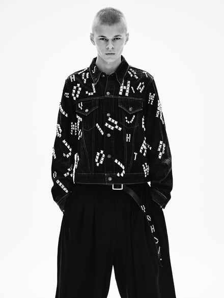 ハリウッド トレーディング カンパニーとのコラボでは、ジャケットやパンツのアパレルアイテムのほか、スタッズショルダーバッグやスタッズベルトなどのアクセサリーを含む9型を用意。トラッカー型デニムジャケット(66万8800円)では、手作業によるスタッズワークで「YOHJI」の文字を表現している。