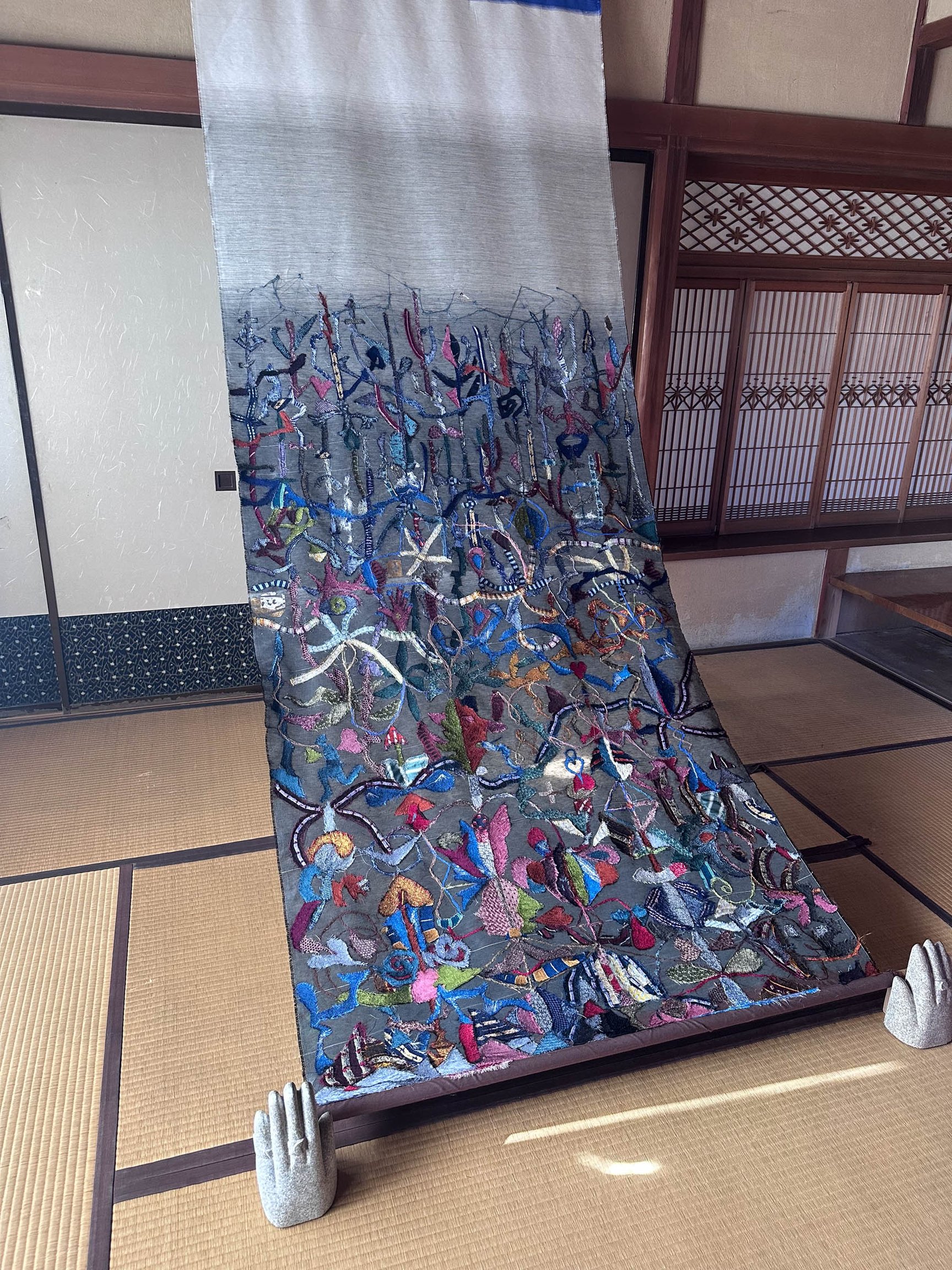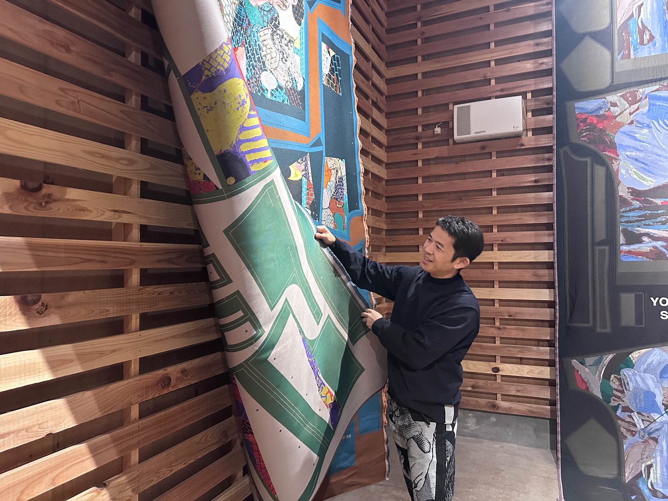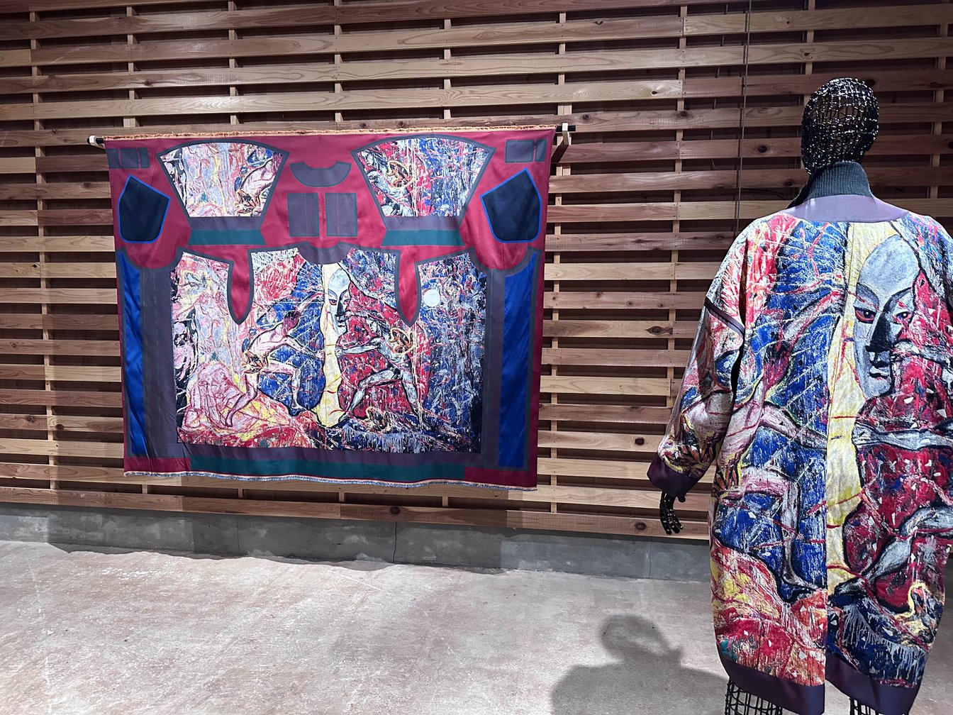 同作は、コロナ禍前の2019年に製作された、故・三宅一生氏と宮前氏が共に手掛けた最後のコレクション。1977年からイッセイ ミヤケのパリコレクションの招待状のデザインを手掛けている横尾氏への恩返しのために企画されたが、発表の場として予定していた展覧会がコロナの影響で白紙になって以降、発表の機会を失っていた。同作で得たテクニックは、後に発表された宮前氏とそのチームが横尾氏と共に⾐服の可能性を追求するプロジェクト「TADANORI YOKOO ISSEY MIYAKE」に受け継がれている。発表の機会を探していたことに加え、同作をはじめとするイッセイミヤケの布作りを長年富士吉田市の隣町である西桂町で行っているという地理的な縁も参加のきっかけとなったという。宮前氏は「横尾先生にも今回のフジ テキスタイル ウィークに出展することをお伝えすると、とても喜んでいただけました。みなさまにご覧いただくことができて嬉しいです」とコメント。「6〜7色の糸の組み合わせによって横尾先生の描く色彩豊かな作品を表現するのは技術的に非常に難しい。テキスタイルとしても高い技術が込められたものになります」と話した。会場では、生地が壁面から少し離して吊るされており、表面だけでなく裏面の仕上げまで美しく織り上げられたテキスタイルを鑑賞することができる。