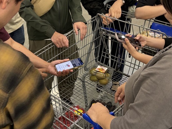 アマゾンのダッシュカートを使った実習。商品を入れるだけで金額が自動計算され、レジを通らずに買い物が完結する“未来のカート体験”を参加者が検証する。