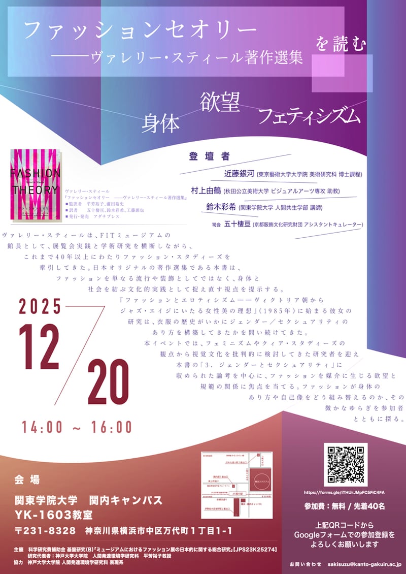横浜の関東学院大学会場では、「『ファッションセオリー――ヴァレリー・スティール著作選集』を読む──身体・欲望・フェティシズム」と題し、フェミニズムやクィア・スタディーズの観点から視覚文化を批判的に検討してきた研究者を迎え、同書の第3章「ジェンダーとセクシュアリティ」に収められた論考を中心に、ファッションを媒介に生じる欲望と規範の関係に焦点を当てるという。東京藝術大学大学院博士課程を修了し、「フェミニスト、ゲームやってる」の著者である近藤銀河や、秋田公立美術大学助教で著書に「アートとフェミニズムは誰のもの?」を持つ村上由鶴らが登壇する。