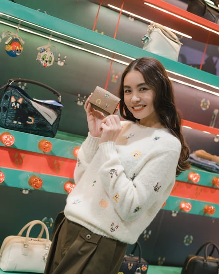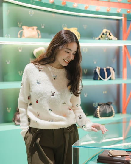最新アイテムを着こなした滝沢眞規子は、「遊び心のあふれるウェインさんの猫の世界観を、ロエベのクラフトマンシップによってモードでラグジュアリーなスタイルに散りばめていて、見ているだけでも心が躍りました」と会場の第一印象をコメント。続けて、「アートに造詣が深いロエベだからこそ、こういうユーモアのあるモチーフも、“大人の遊び心”が込められたファッションに昇華されていて素晴らしいと思います。先行販売のパズルバッグはコーディネートのアクセントになるので、シックでもカジュアルでも、さまざまなスタイリングに合わせられるのも発見でした」と語った。