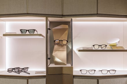 店舗デザインは、日本の伝統美とモダンな感性を融合。1階のファサードは、シャンパンカラーのメタルワークとデジタルアートで、ガラス越しに広がる壮麗な空間を表現したという。同じく1階のメインサロンは、青みを帯びた大理石とウッドの幾何学パターンを基調に、大理石のカウンターテーブルを配置。地下1階は、シアーなブルーのベルベットに、ウッドと大理石のテーブルを備えた。最上階となる2階には、プライベートサロンを用意。シルクで包まれた壁面には日本の屏風を想起させるラインを施し、シャンパンメタルとガラスのディスプレイには、折り紙の美学を昇華させたという。同サロンでは、ダイヤモンドをあしらった煌びやかなゴールドフレームなど、希少価値の高いアイウェアに加えて、限定アイテムを揃えている。