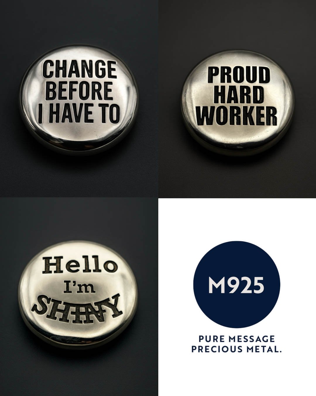 M925は、「大切にしたい言葉を胸に」をコンセプトに掲げる原宿を拠点とするジュエリー缶バッジブランド。貴金属のボディに「言葉」を刻印した、“ジュエリーとしての缶バッジ”を提案する。ブランドは、コピーライターとして、業務の中で15年以上国内外のさまざまなクライアントに対して広告コピーを提案してきた中川が、キャンペーンが終わったら取り下げられてしまう「言葉」を消費させずに残すための方法として、商品を通して「コピーそのものを商品やブランドにする」ために発足。服好きでもある中川は、趣味として缶バッジをコレクションしているが、缶バッジがかつて政治的なプロパガンダやキャンペーンに利用されてきた歴史を背景に、ヴィンテージの缶バッジは現代では身につけにくいメッセージが入っているものが多いことを受け、現在の自分が身に付けたい言葉を長年大切にできる素材を使用した缶バッジに落とし込んだという。ブランド名の「M」は「メッセージ(Message)」と「メタル(Metal)」の頭文字から、925はシルバーの純度を示す「SILVER 925」から引用。ファーストコレクションでは、メッセージが異なる3型を発売する。価格はいずれも3万8500円。