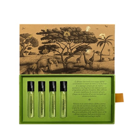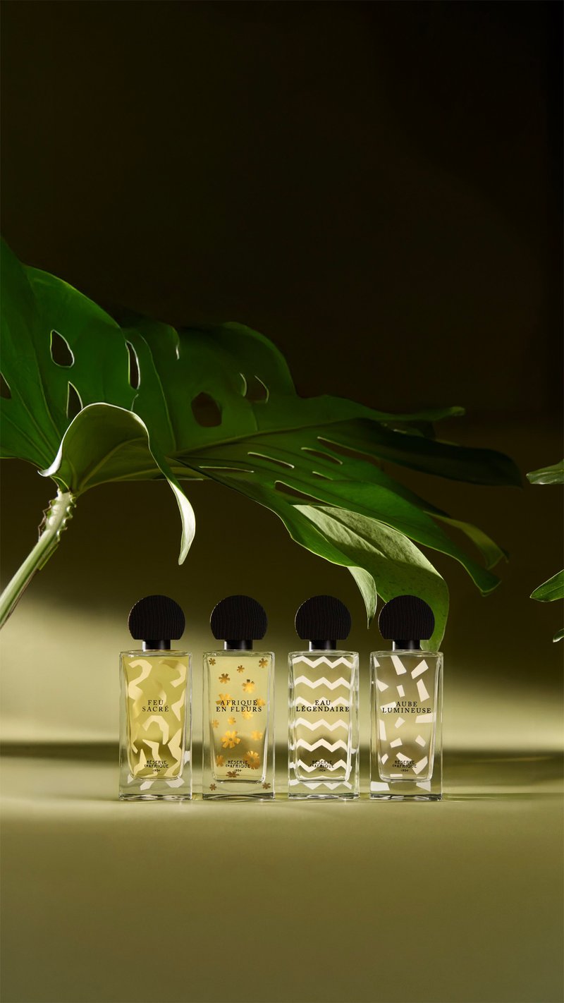 「オーブ ルミヌーズ」は、南アフリカの朝日と熱の灯った大地をイメージ。タンジェリンやブラッドオレンジなどのきらめくような柑橘の香りが、生命が再起動する光の原野の夜明けを想起させる。「アフリク アン フルール」は、荒れた大地の裂け目から芽吹く神秘の花に着想。ローズとアイリスといった花々が、うっとりするような香りで包み込む。「オー レジェンデー」は、森の奥で静かに湧き続ける水源を表現。みずみずしいバイオレットリーフや、ウッディなオリバナムが、神聖なオアシスへと誘う。「フー サクレ」は、クローブなどのスパイスや、ミルラによって、壮麗な焚き火のような香り立ちを叶えた。加えて、4種のフレグランスをミニサイズでセットにしたパフュームキットを販売する。