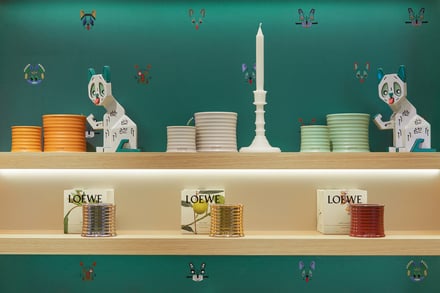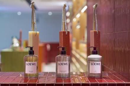 店内には、ロエベ パルファム コレクションのフルラインナップを展開する。このほど発売したロエベ ホームセンツの「ロエベ キャンドル ブラック セサミ」(3万7400円)、「ロエベ キャンドル アールグレイ」(3万7400円)、「ロエベ キャンドル スイートアーモンド」(3万7400円)の3種をはじめ、バーソープ(9900円)、リキッドソープ(1万1000円)、ハンド ローション(1万1000円)、ボディローション(1万2100円)など、ホリデーギフトにも最適なアイテムを提案。加えて、フレグランスシリーズ「LOEWE Botanical Rainbow」(ロエベ ボタニカル レインボー)やプレミアムライン「LOEWE Un Paseo Por Madrid」(ロエベ・ウン・パセオ・ポル・マドリード)、さらに「LOEWE Home Scents」(ロエベ ホームセンツ)のボタニカルな製品群も豊富に取り揃える。
