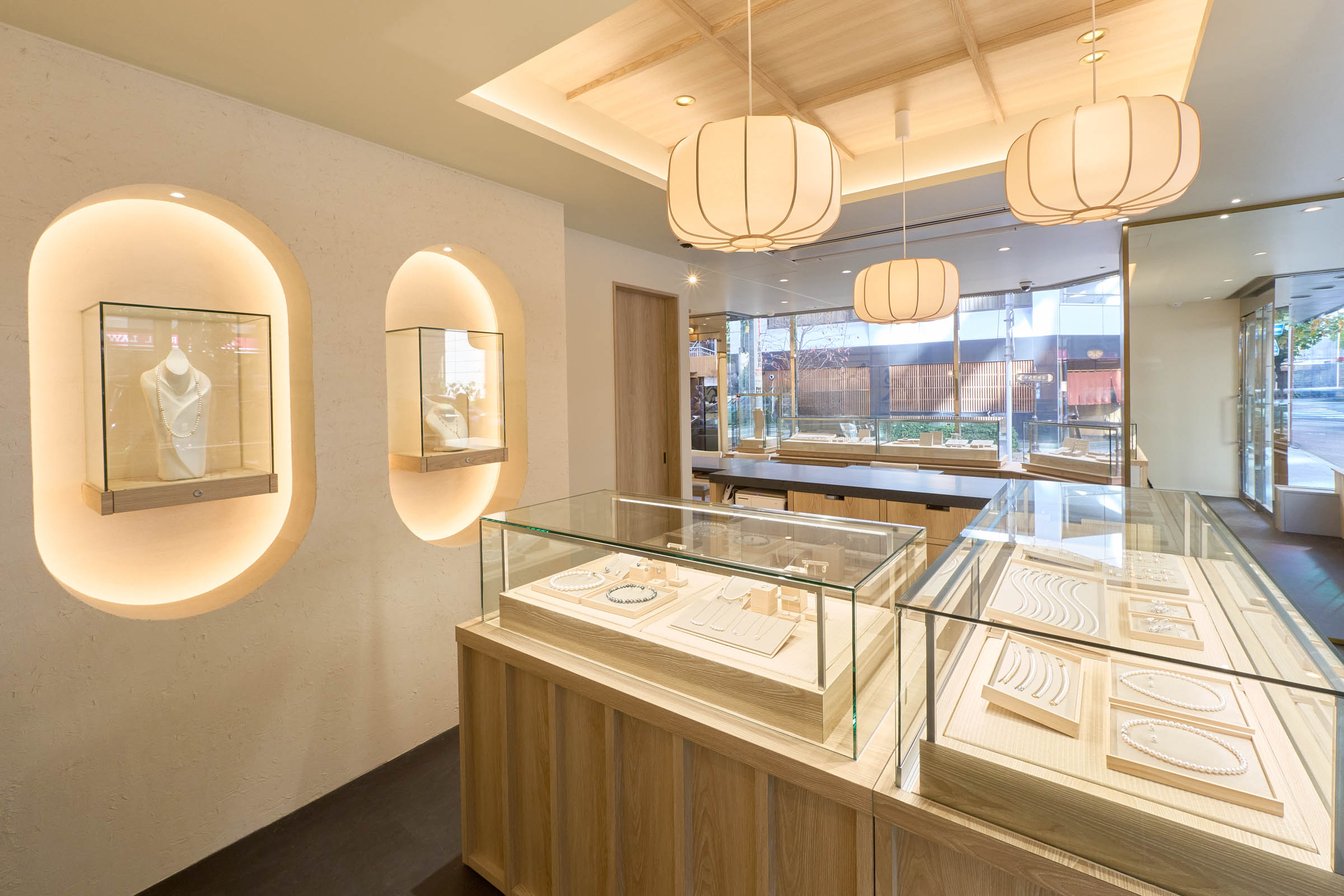 リニューアルした銀座本店では、杉材、和紙、畳といった日本の天然素材を使用して空間を設計。杉材フレームに和紙をあしらった雪洞照明や、畳を敷いた白木のショーケースなど、日本産のアコヤ真珠を引き立てるオリジナルの什器を揃えている。銀座のメイン通りからは少し外れたエリアに位置するが、「以前は少なかったものの、現在はこの店のある通りにもインバウンドの方々が多く通るようになりました」とWSPの藪野真紀子代表取締役社長。海外でも高いクオリティのパールとして「アコヤ」ブランドは知られており、日本土産を求めて訪れるインバウンド客も多いことから、外観は外からでもわかりやすいガラス張りで仕上げた。