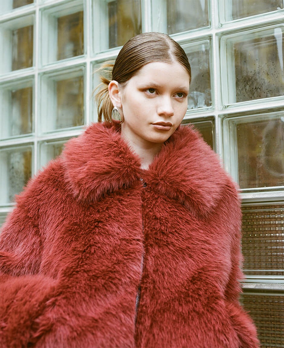 coat by & OTHER STORIES, top by ELLE, hat by RUMPLE, earrings by TRUE VINTAGE, skirt, tights and shoes stylist's own