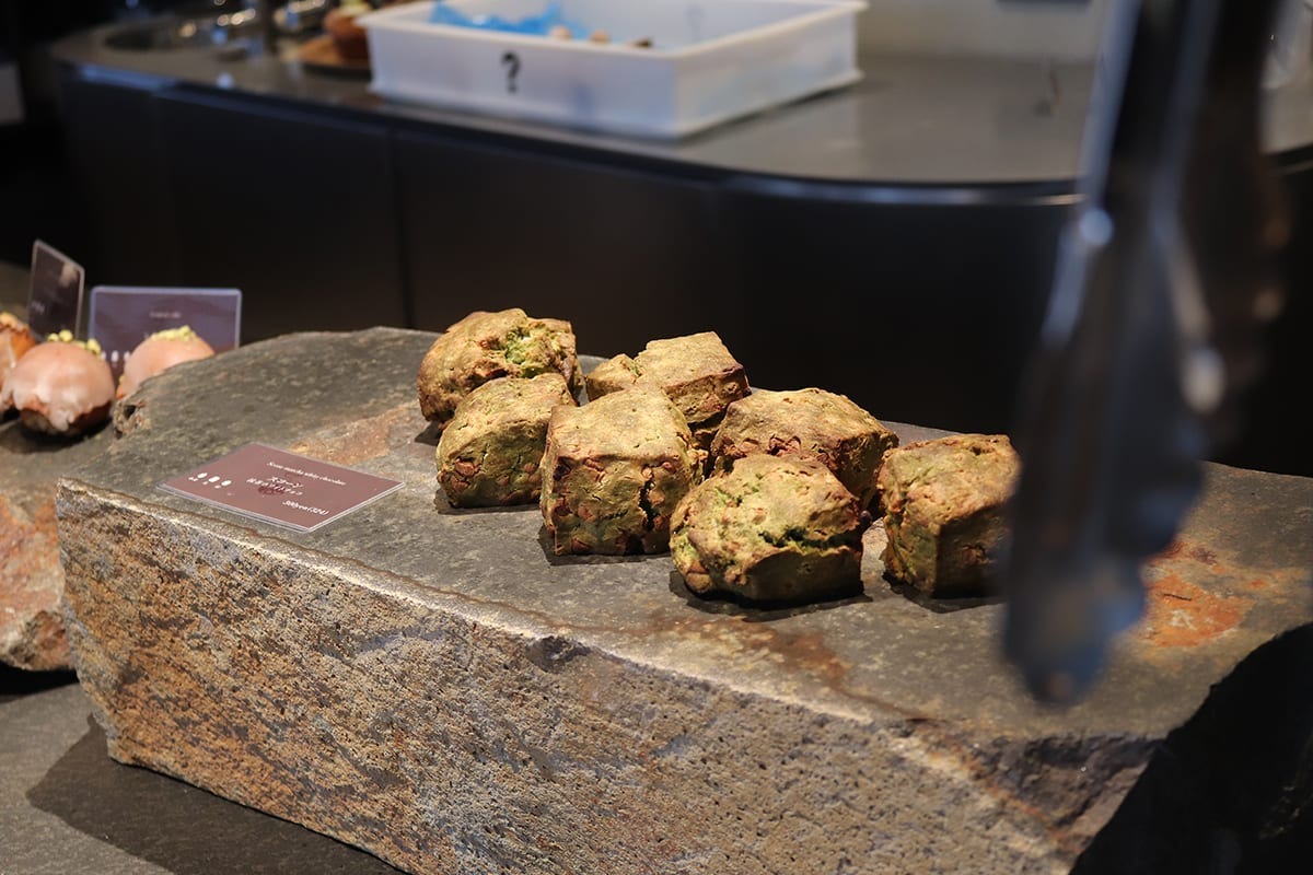 スイーツから惣菜系まで、選べる焼き菓子は50種類以上!迷うのは必至だ。石のような形の抹茶とホワイトチョコのスコーンなど、平子シェフらしいユーモアとアイデアが織り混ぜられた焼き菓子の数々が魅力的。価格のレンジは300円台〜800円台と幅広く設定されているのも嬉しい。