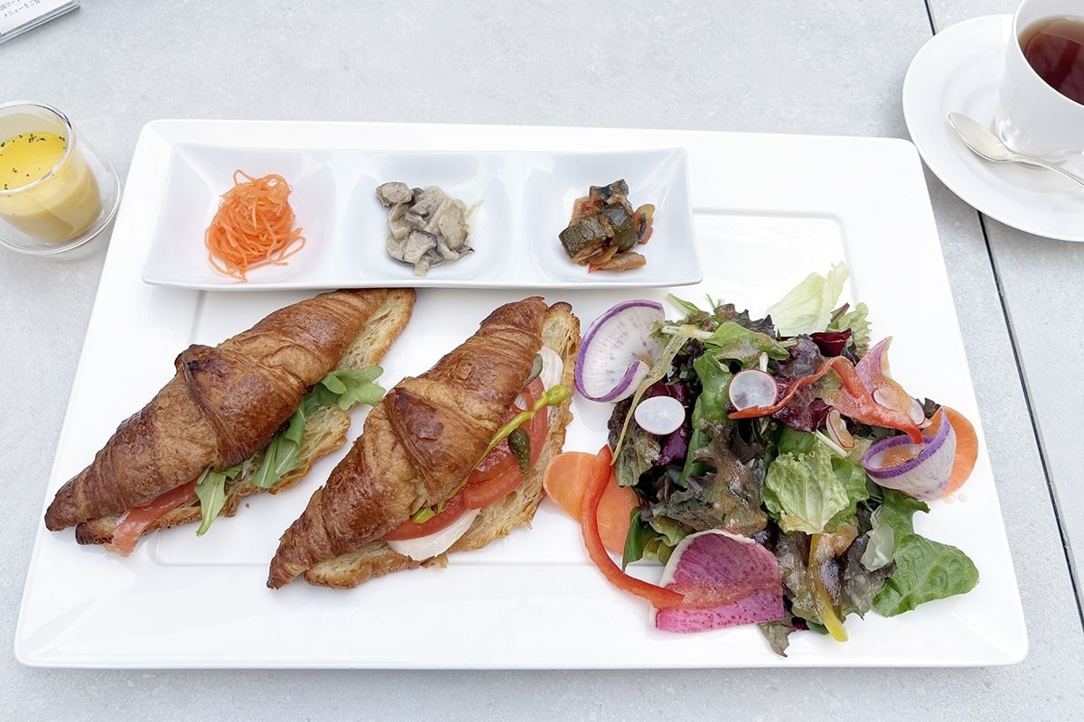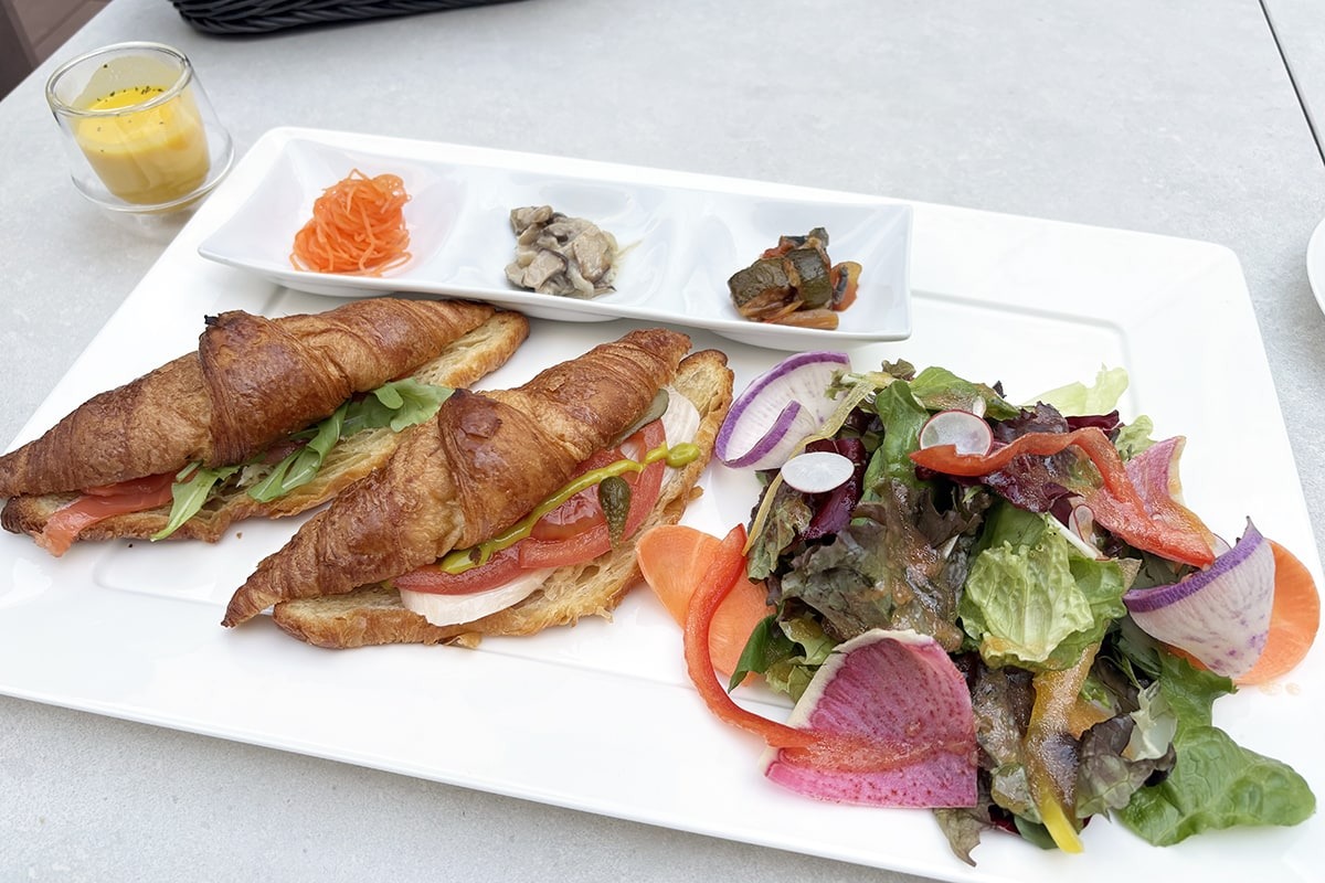 大きなプレートに乗った色鮮やかなランチセット「2種類のクロワッサンサンド」が運ばれてきて、テンションがあがる!まずはサラダから。パブリカや水菜の程よい苦味とドレッシングの酸味がマッチしてさっぱりとしたおいしさ。