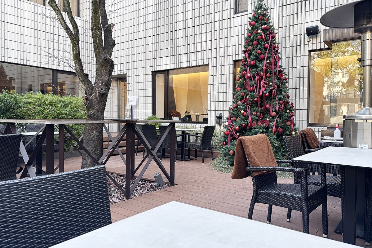 お店に到着したのは、ランチどきの13時半頃で店内は満席。テラス席がちょうど空いたタイミングで、今日は天気もいいのでラッキー!テラス席をチョイス。クリスマスツリーもあって気分にピッタシ!屋外用ストーブの隣の席に案内してもらい、アウターなしで心地よく過ごせるちょどいい気温だ。