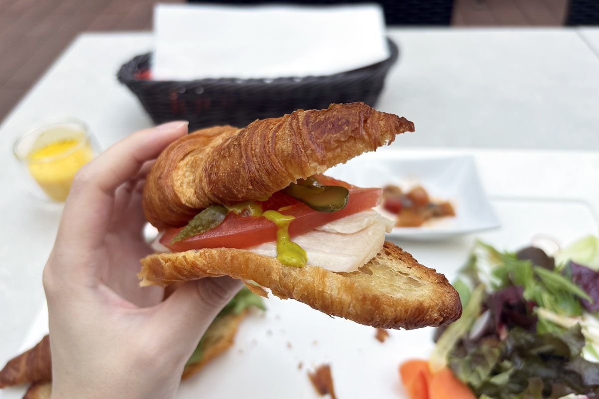 続いて、右側のクロワッサンサンド。サンドされているのは、鳥取県の人気銘柄鶏「大山鶏」!鶏肉なのでライトかと思いきや、しっかりと食べ応えと旨みがある。グリーンマスタードが抜群に効いていてめちゃくちゃおいしい!