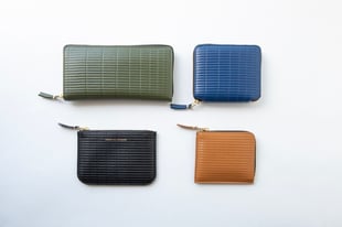新作には素材にラムレザーを採用し、デニムの転写プリントをデザイン。4ヶ所のカード入れ、コインポケット、紙幣入れを備えた二つ折りZIP(6万1600円)、コイン入れと2ヶ所のオープンスペースを有するL字型ZIP(3万7400円)、ZIPポーチ(大 5万3900円、小 3万6850円)の4型をラインナップする。