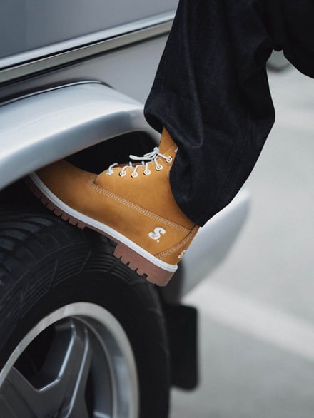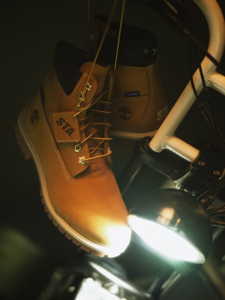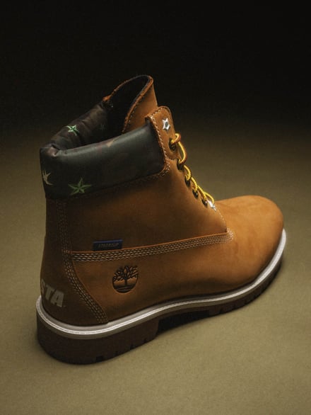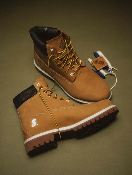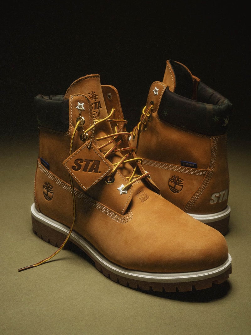 コラボアイテムは、ティンバーランドの「6インチ プレミアム ウォータープルーフ ブーツ メンズ(通称 : オリジナル イエローブーツ)」の耐久性や機能性に、ものづくりを通して海洋探検へのリスペクトを表現しているSTA.の美学とクラフトマンシップを融合。シュータンには、「海训(海上訓練の意)」のエンボス加工を施し、履き口にはSTA.のクラシックなカモフラージュパターンを採用した。サイドには海で使われる信号旗を思わせるブルーのラベルを配し、シューレースホールは星型にアレンジした。価格は3万5200円。