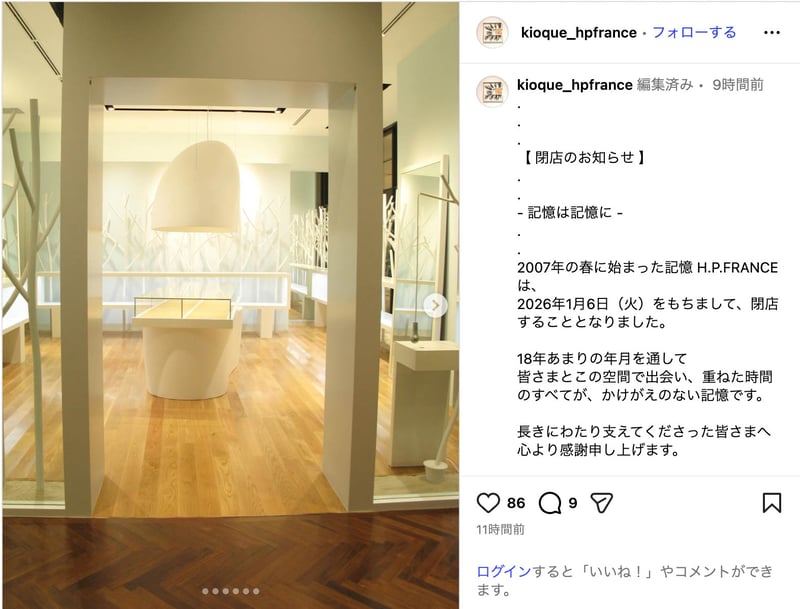 セレクトショップ「記憶 H.P.FRANCE(キオク アッシュ・ペー・フランス)」が、2026年1月6日に閉店する。